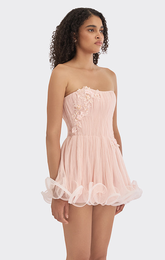 Each swirl at the hem is sculpted by hand, with horsehair tucked inside to hold its bounce a technique borrowed from the past, now reimagined with lightness.