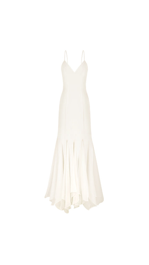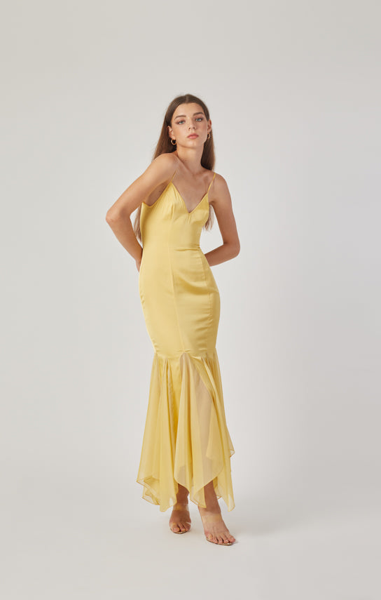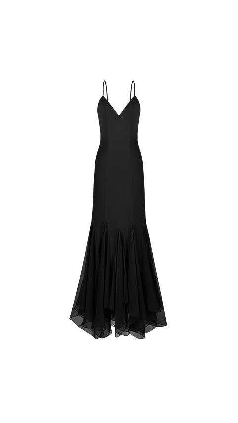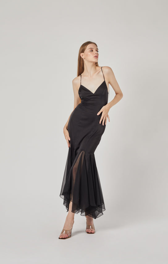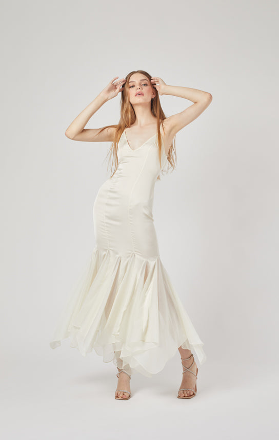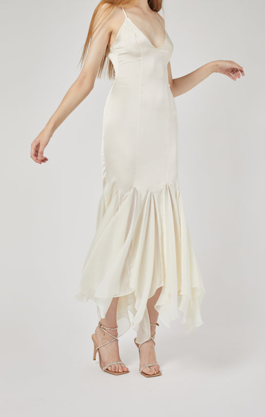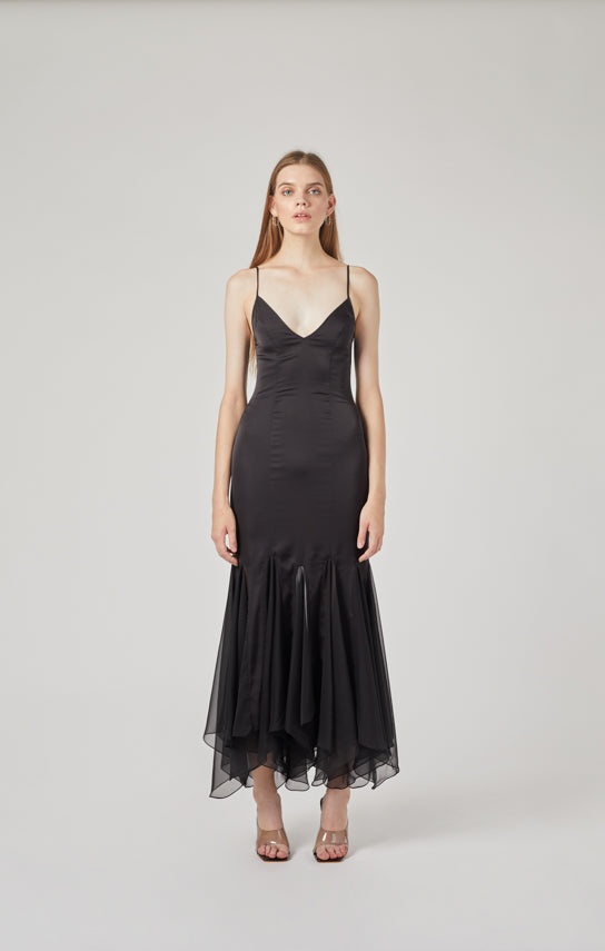 Ms. Godet Maxi Slip Dress, tailored from silky satin, is designed with a looser silhouette using a bias cut technique to create a natural drape effect. The Godet technique emphasizes fullness and volume at the bottom dress with the use of precisely cut triangular chiffon panels inserted between the main fabric. The classically seductive slip silhouette is completed with a low-cut back.