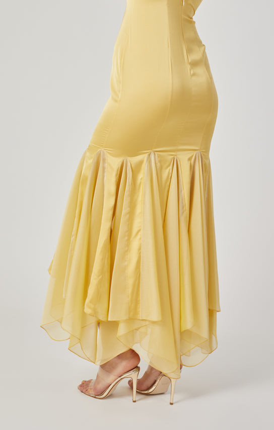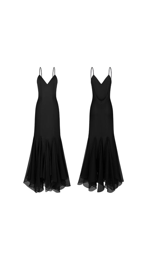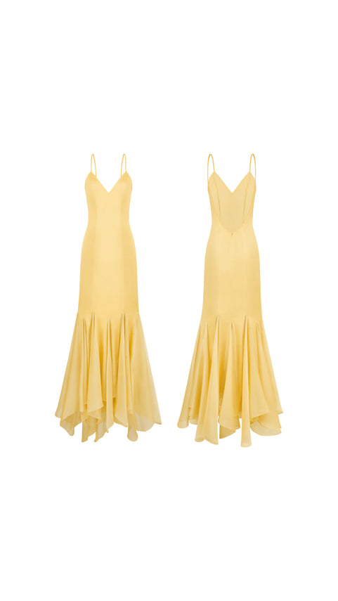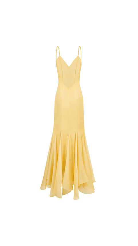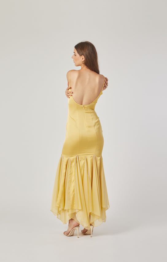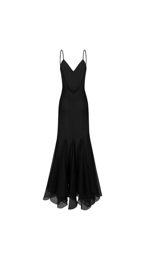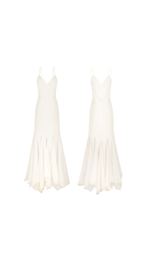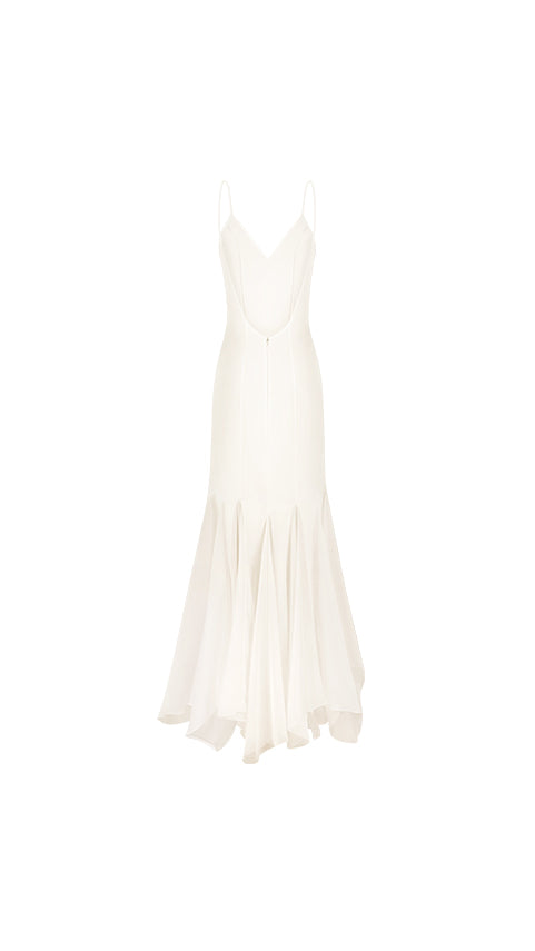 Ms. Godet Maxi Slip Dress, tailored from silky satin, is designed with a looser silhouette using a bias cut technique to create a natural drape effect. The Godet technique emphasizes fullness and volume at the bottom dress with the use of precisely cut triangular chiffon panels inserted between the main fabric. The classically seductive slip silhouette is completed with a low-cut back.