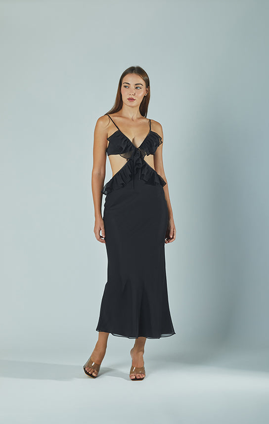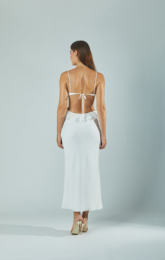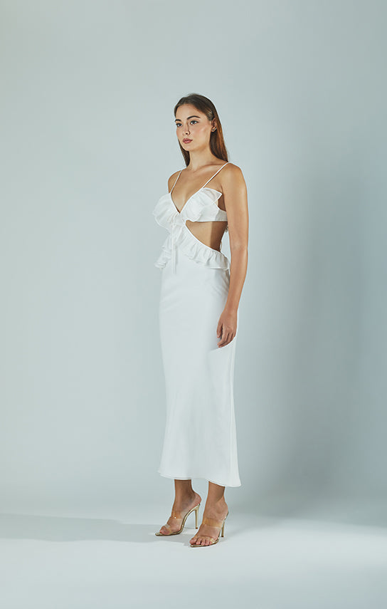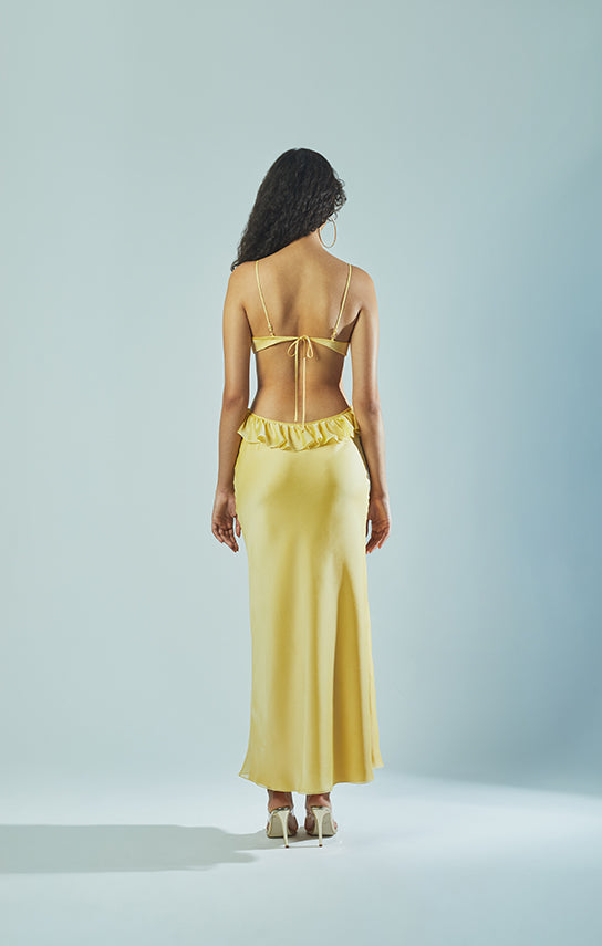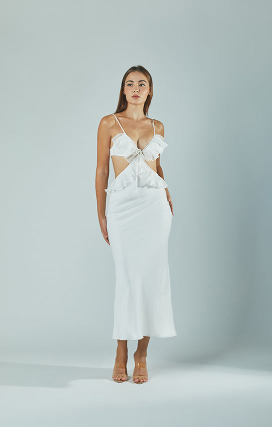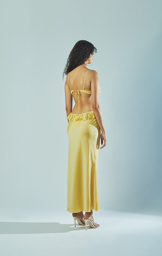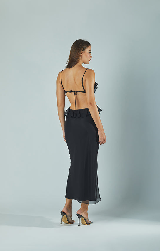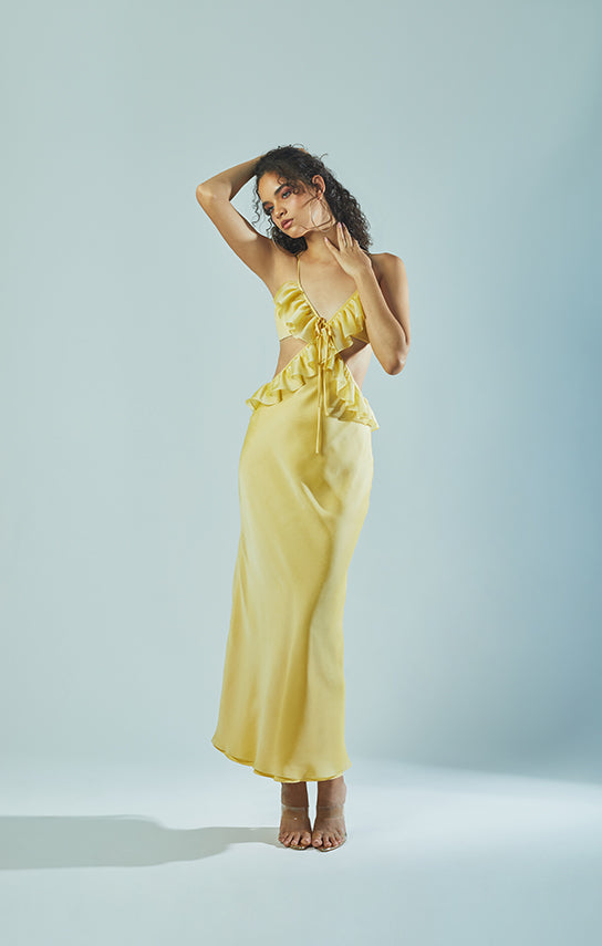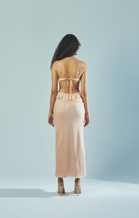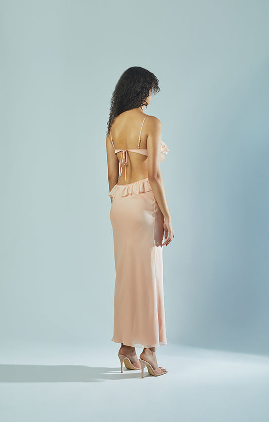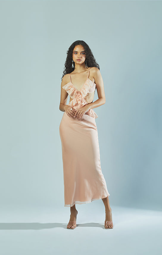 'Ruffle Maxi Slip Dress' by Stolen Studios x Onarin features two separated pieces, a bra-style ruffled top and detachable ruffled maxi skirt. The ruffled top has adjustable strap details and light boning construction at the bust. The ruffled maxi skirt ties at the bust and features a curve-accentuating cutout with a bias cut. Slim fit with a slightly flared hem. Thai Silk Chiffon outer layer. Premium Satin inner layer. Ruffles are hand crafted individually.