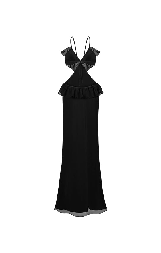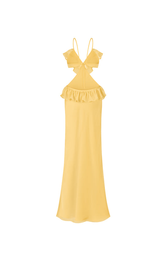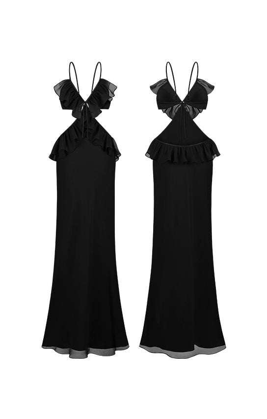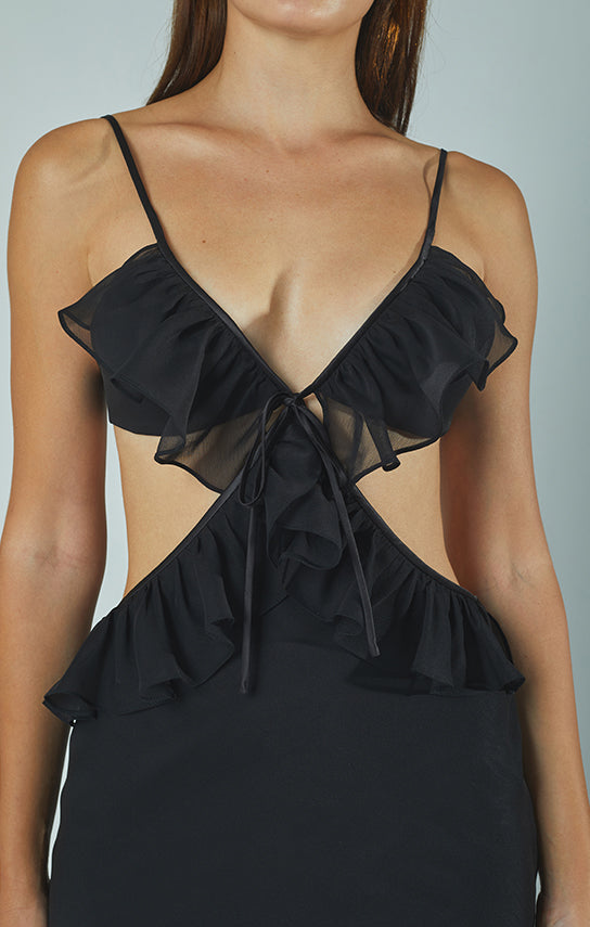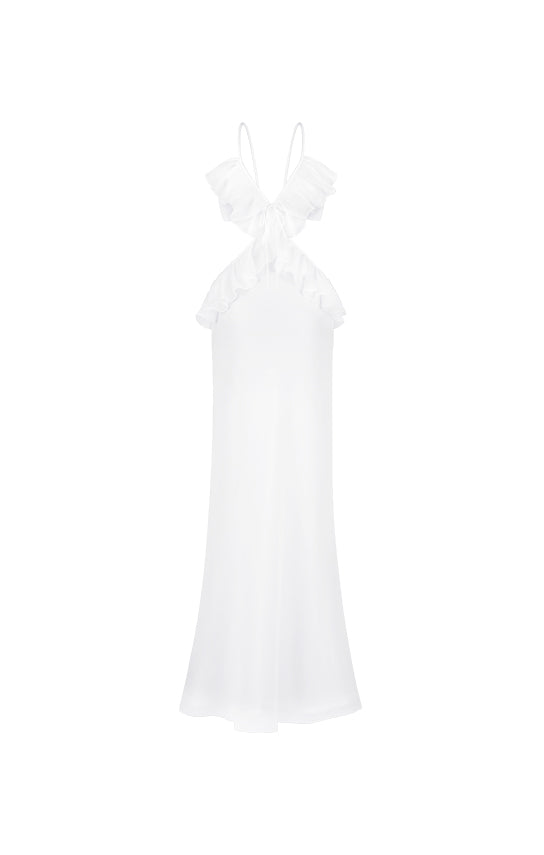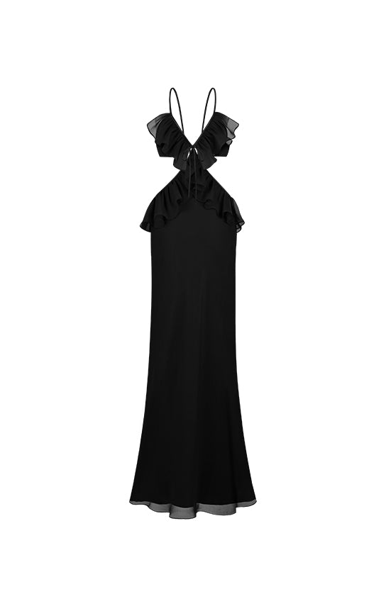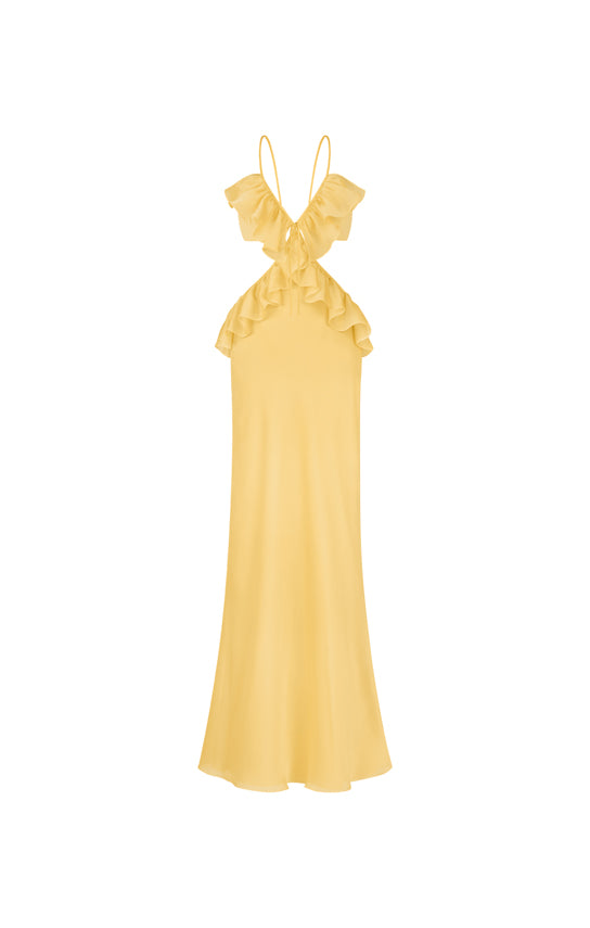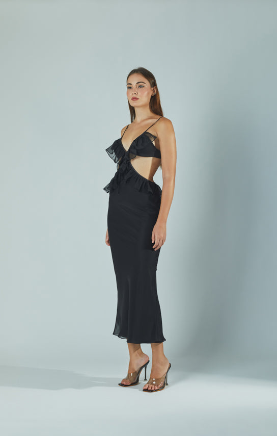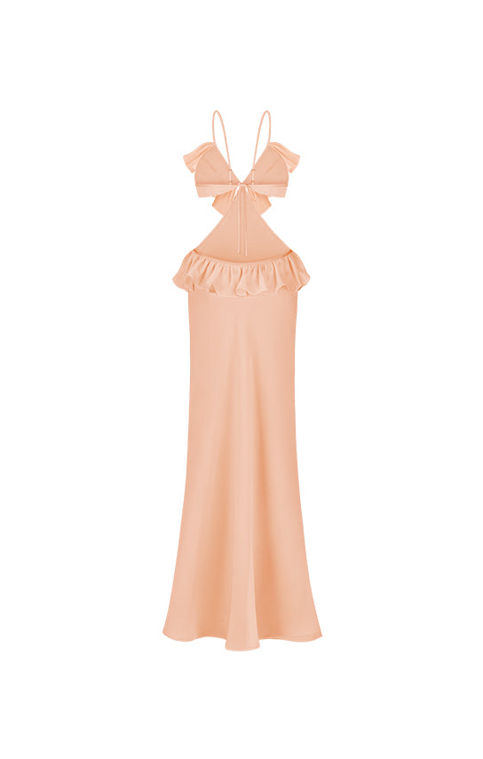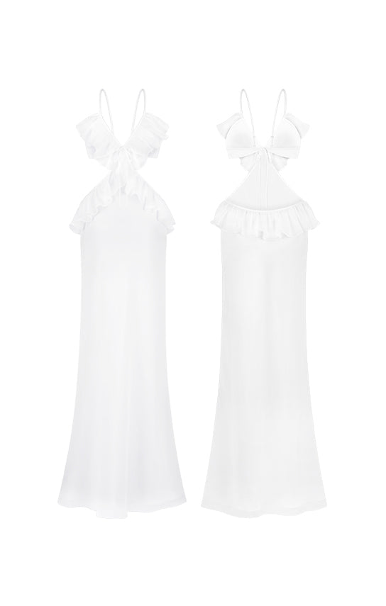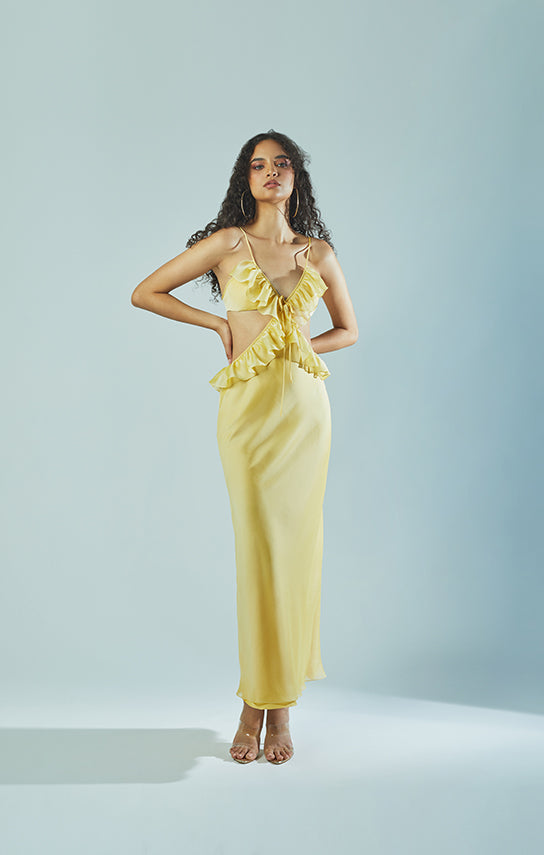 'Ruffle Maxi Slip Dress' by Stolen Studios x Onarin features two separated pieces, a bra-style ruffled top and detachable ruffled maxi skirt. The ruffled top has adjustable strap details and light boning construction at the bust. The ruffled maxi skirt ties at the bust and features a curve-accentuating cutout with a bias cut. Slim fit with a slightly flared hem. Thai Silk Chiffon outer layer. Premium Satin inner layer. Ruffles are hand crafted individually.