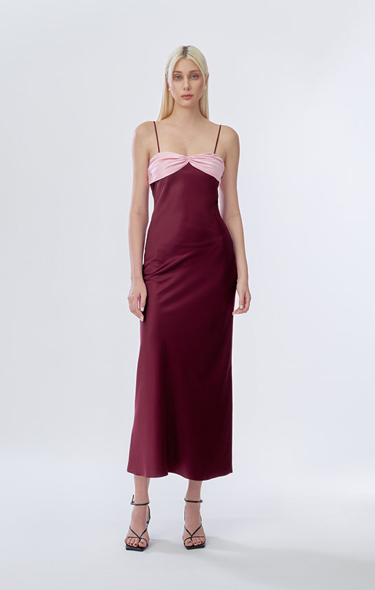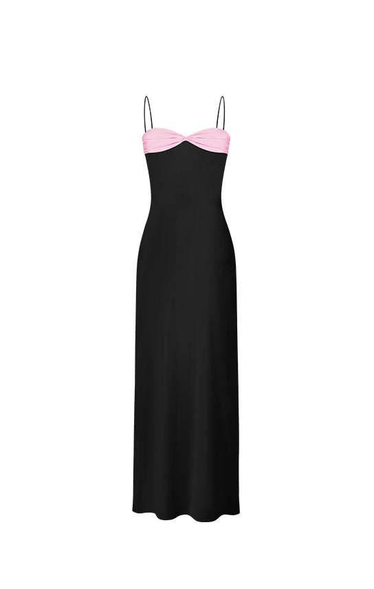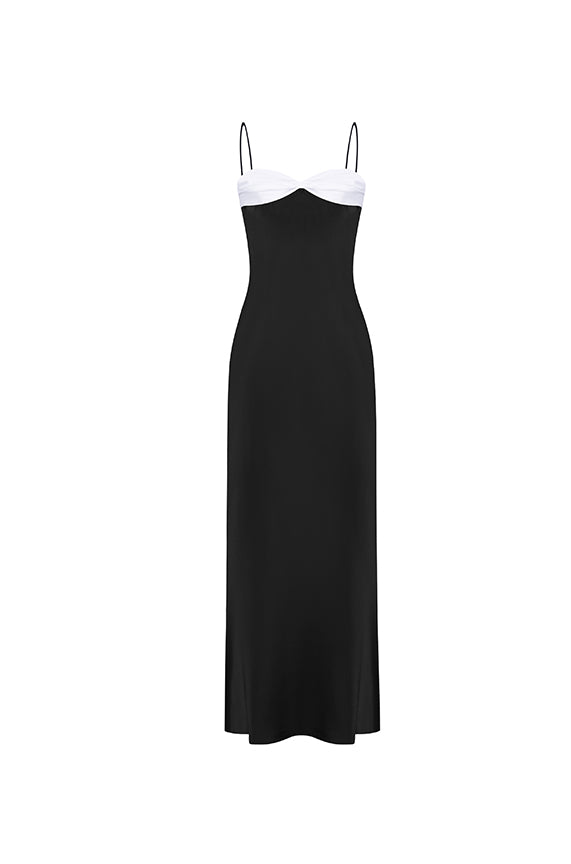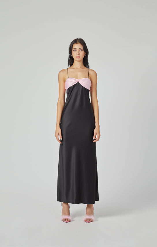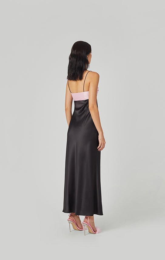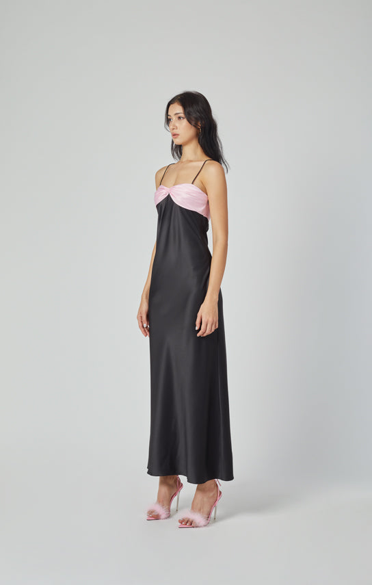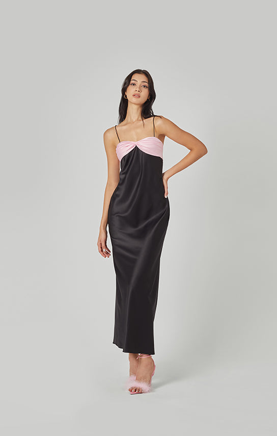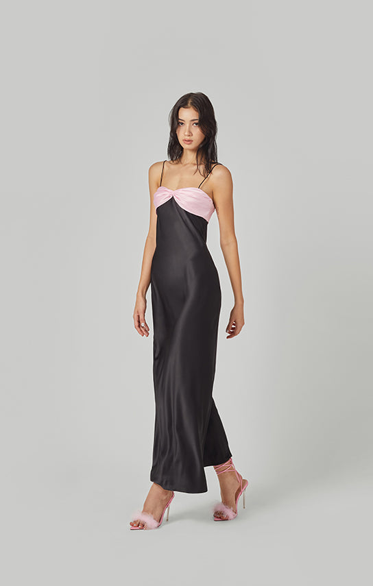 Stolen Studios' new Swan Slip Dress has a signature clean-cut, featuring soft elegant hand- tucked mini drapes over the bust and spaghetti straps. The use of the finest silk satin in a two-tone black and white cut on the bias to gently skim your figure accentuates only one message - a focus on timeless elegance. Finish off the look with the crystal-embellished black satin pumps.