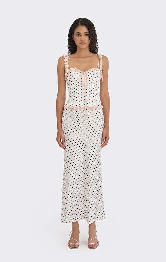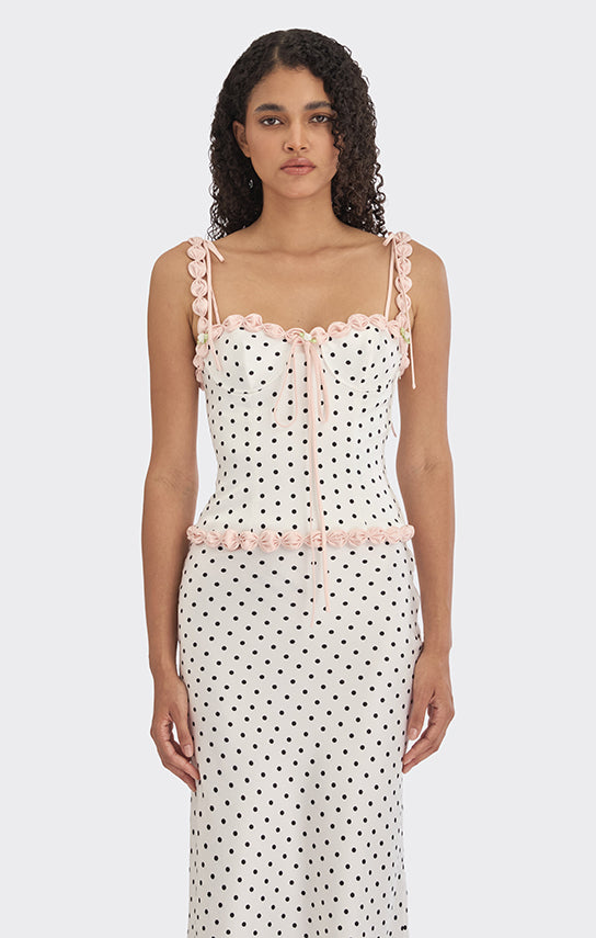 A vintage treat reimagined. This polka dot bustier takes its cues from homemade cakes—trimmed with handmade satin “whipped cream” and finished with ribbon tie details. Soft, structured, and undeniably sweet.