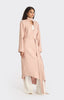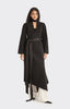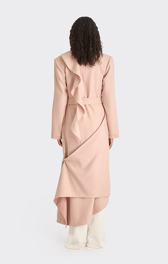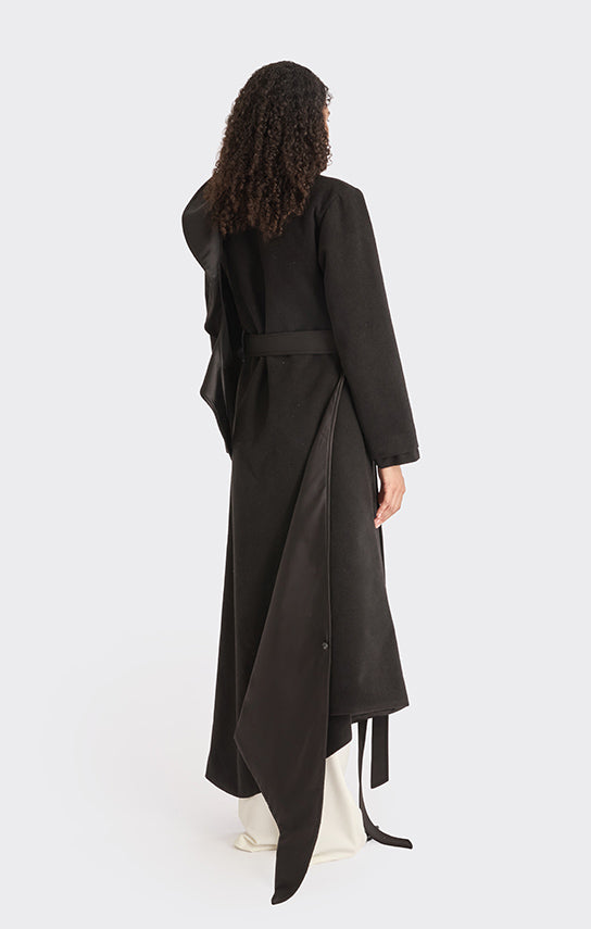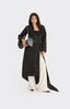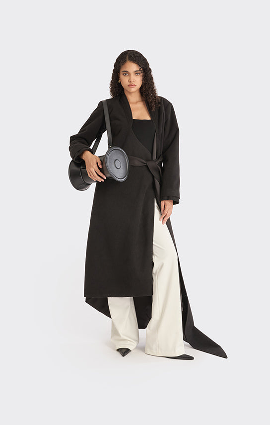 A continuation of the spiral story, this coat translates the once-doodled circle into a sculptural wrap — quiet yet decisive. The silhouette curves with intention, folding across the body like memory in motion.