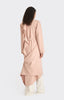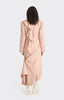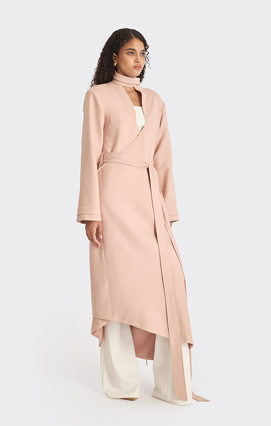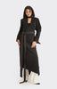 The spiral reimagined: a draped collar mimics a scarf, while the hem cuts forward into the unknown. It’s a meditation on transformation — embracing change without needing to name it.