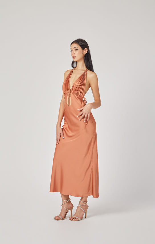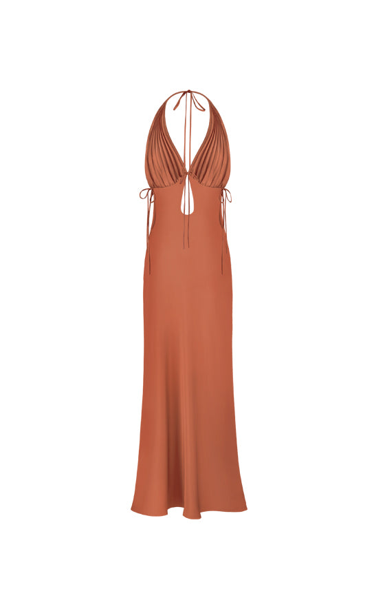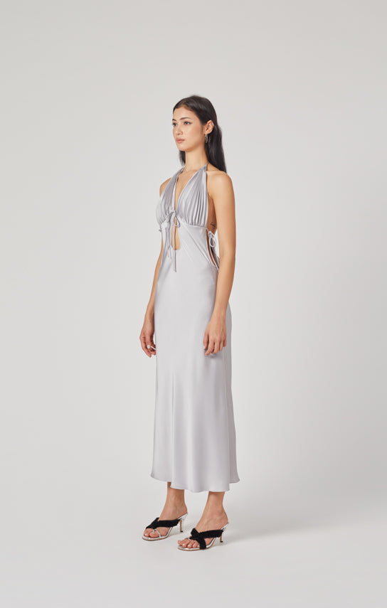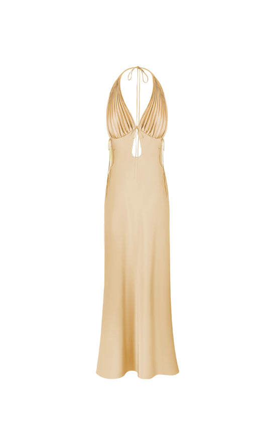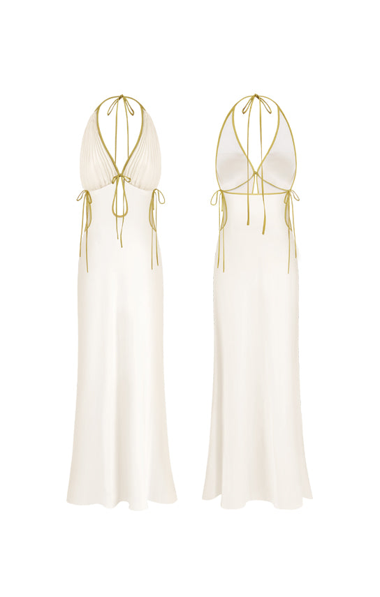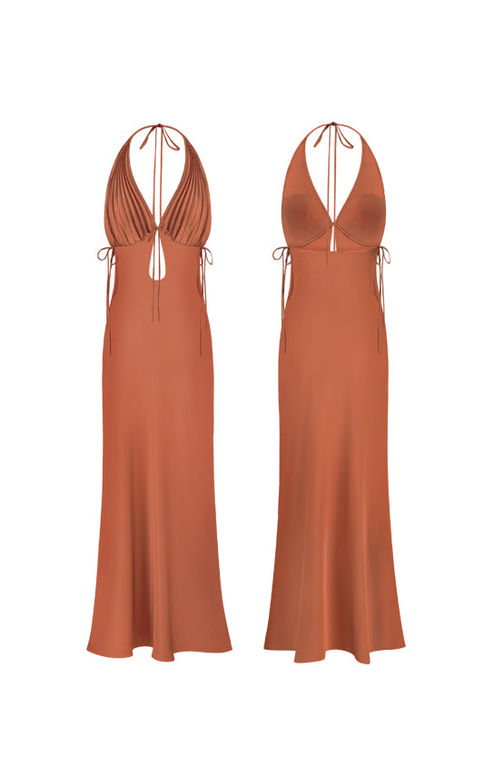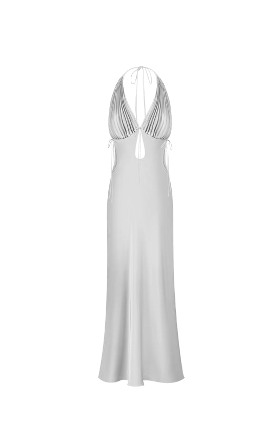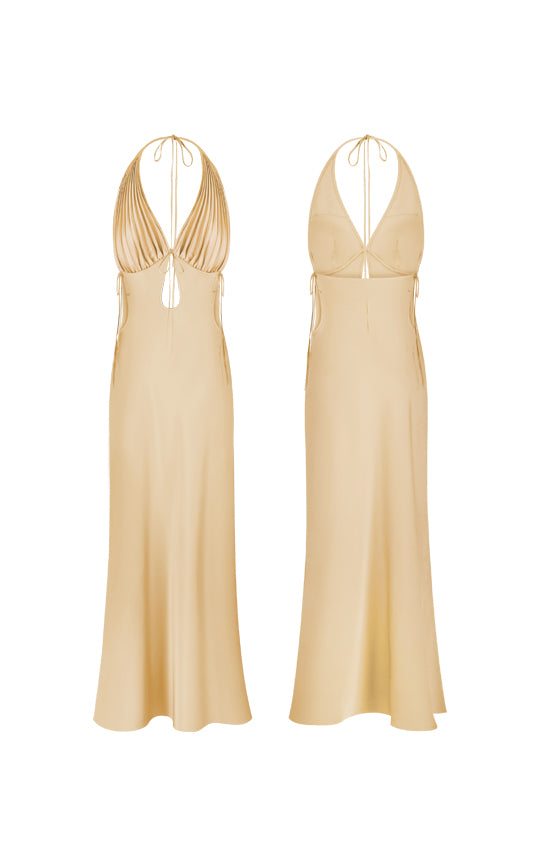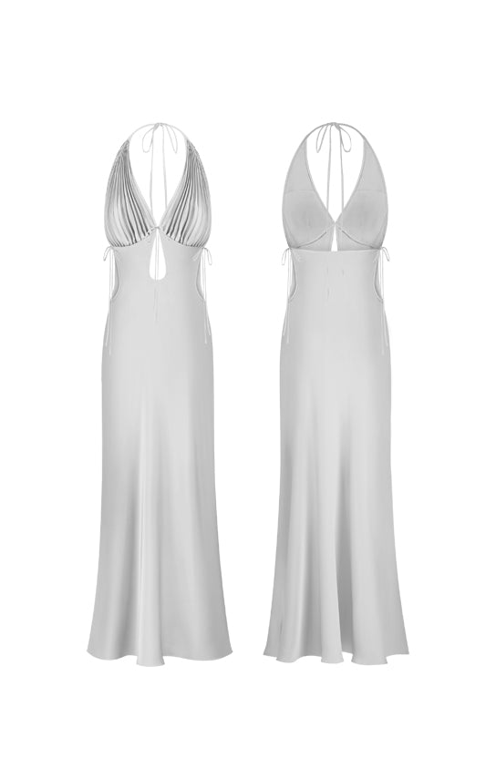 Ms. Pleat Tear Drop Dress, the House of Pleat 2022 iteration by Onarin. It features the House's signature pleat gathering at the bust, complimented with a distinct tear drop at the center. It is designed with a halter v-neckline and open back, with ties clousure on the front and side. A bias cut technique is used to ensure it naturally drapes over your body, accentuating ones silhouette.