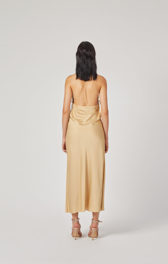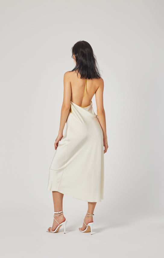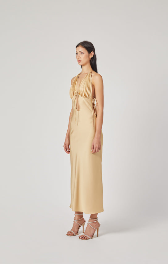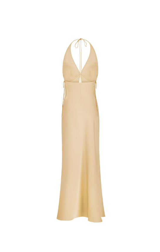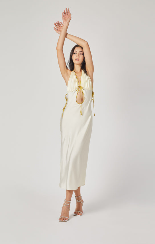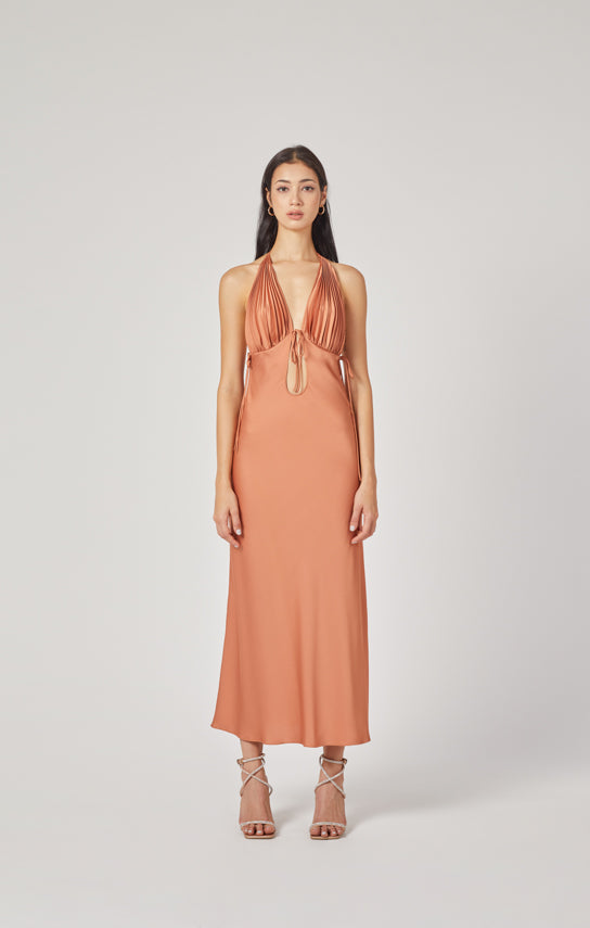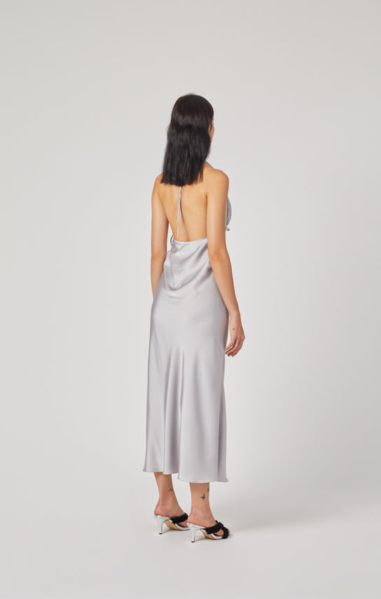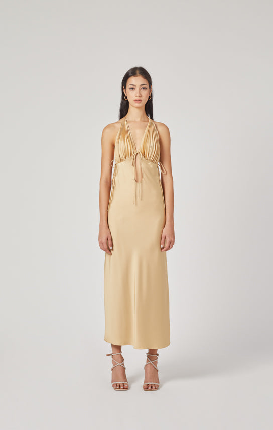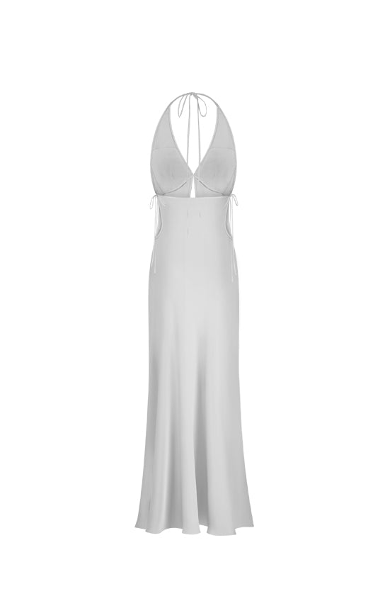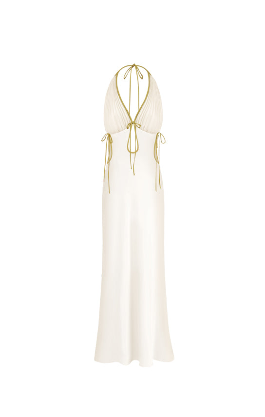 Ms. Pleat Tear Drop Dress, the House of Pleat 2022 iteration by Onarin. It features the House's signature pleat gathering at the bust, complimented with a distinct tear drop at the center. It is designed with a halter v-neckline and open back, with ties clousure on the front and side. A bias cut technique is used to ensure it naturally drapes over your body, accentuating ones silhouette.