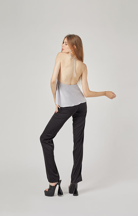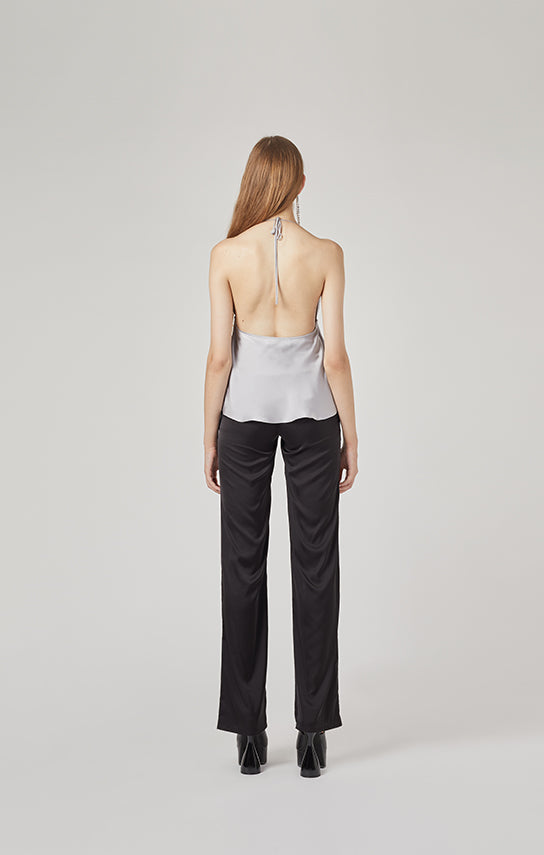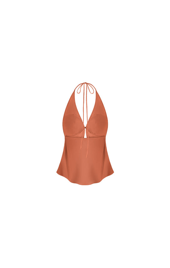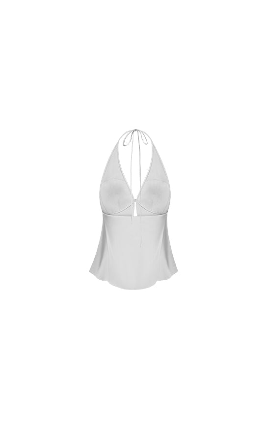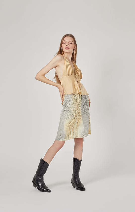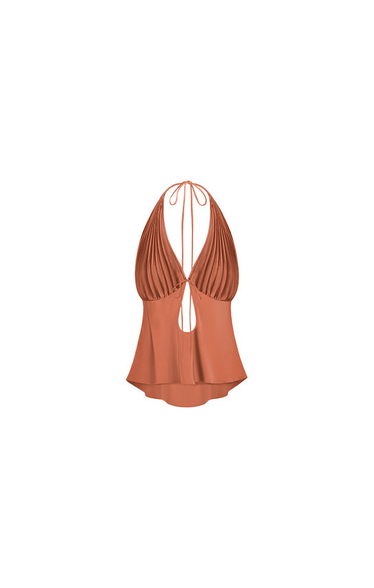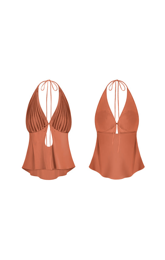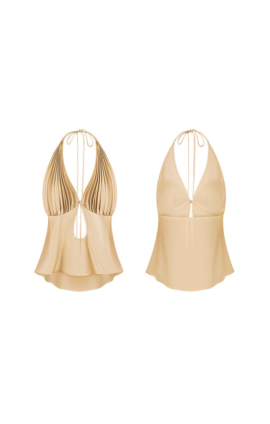 Ms. Pleat Tear Drop Top, the House of Pleat 2022 iteration by Onarin. It features the House's signature pleat gathering at the bust, complimented with a distinct tear drop at the center. It is designed with a halter v-neckline and open back, with ties clousure on the front and side. Perfectly versertile with a mini skirt for a night out or jeans in the summer for brunch.