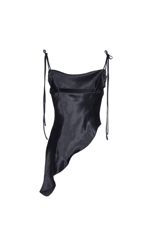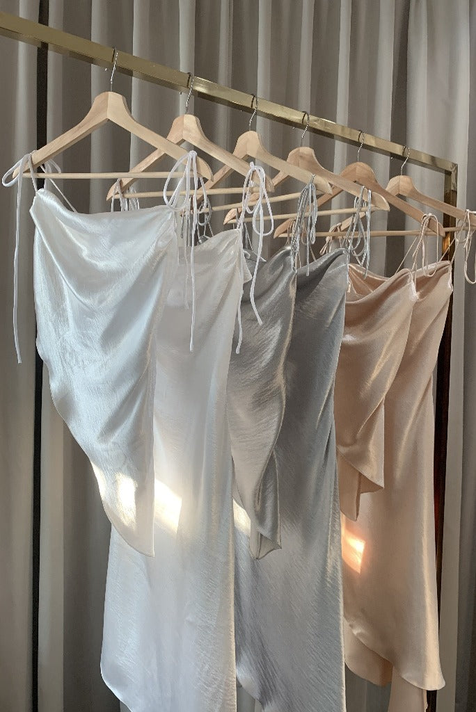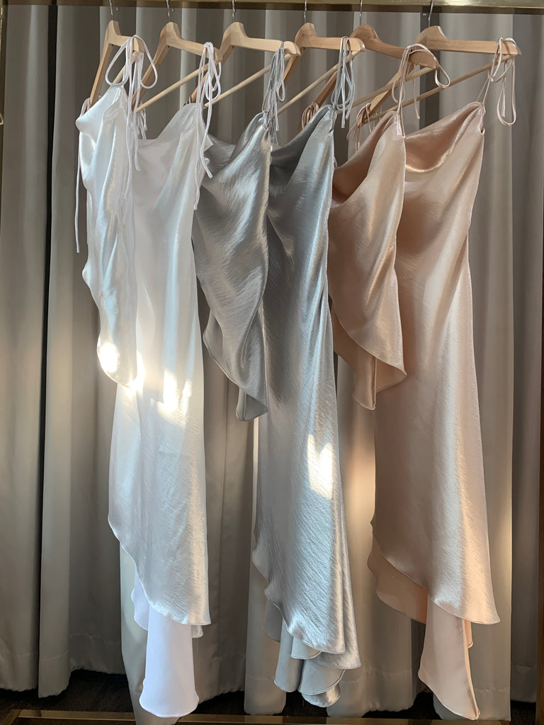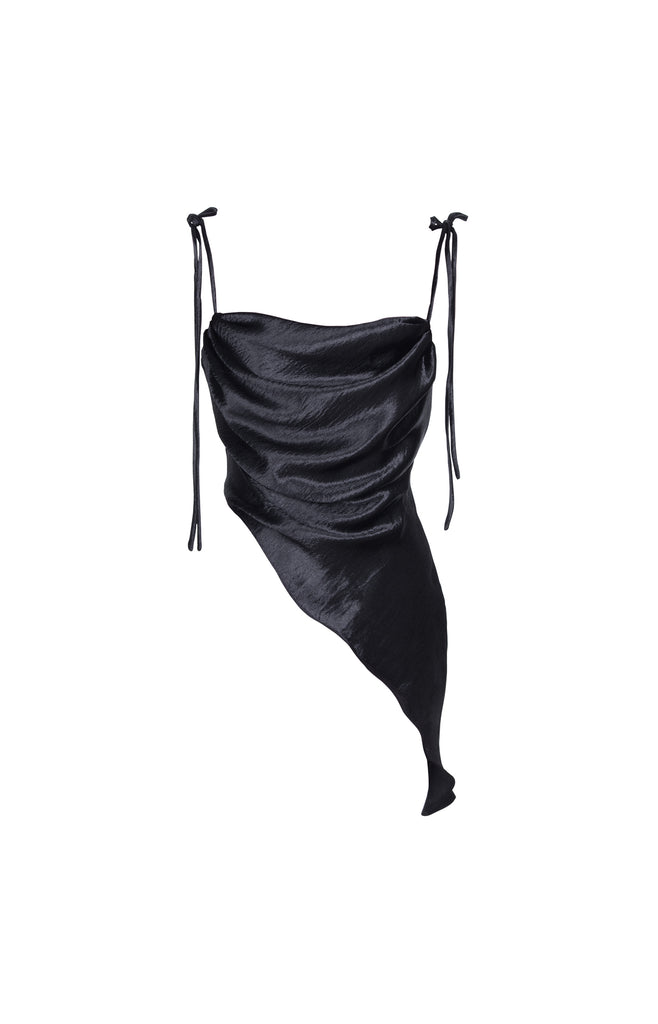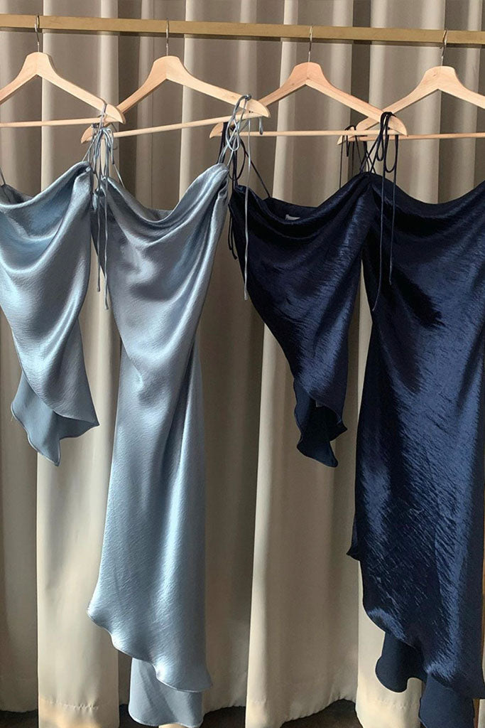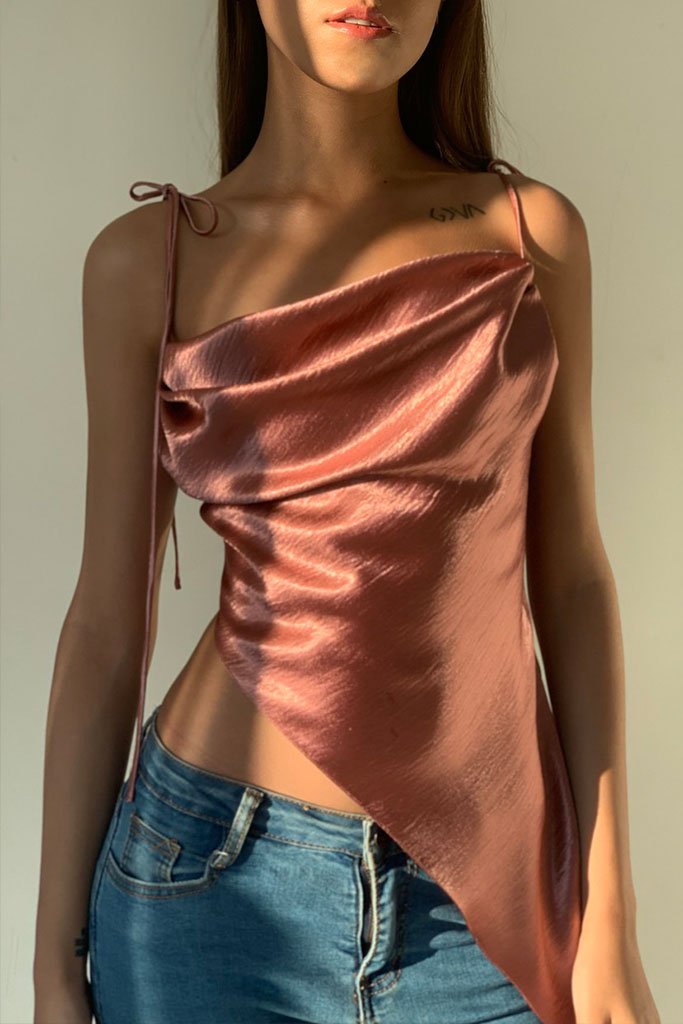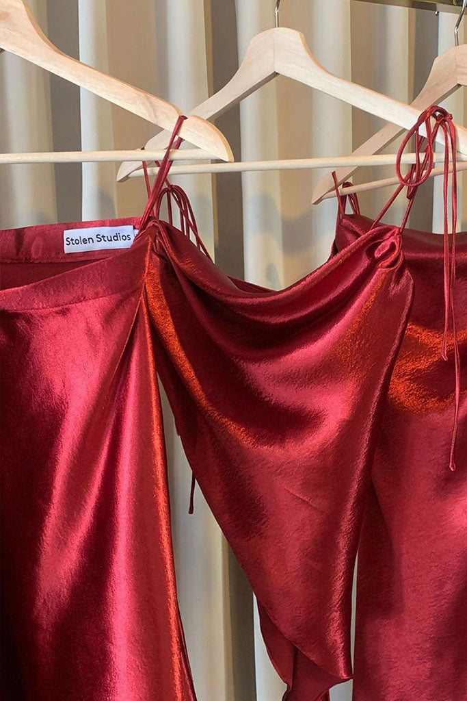 Stolen Studio’s exclusive piece exhibits a dramatic cowl neck. It has bow-tie straps to be fitted through the bodice in a flirty silhouette. It’s crafted with an asymmetric hem. Dress it down with straight-leg denim and ankle boots on the weekend.