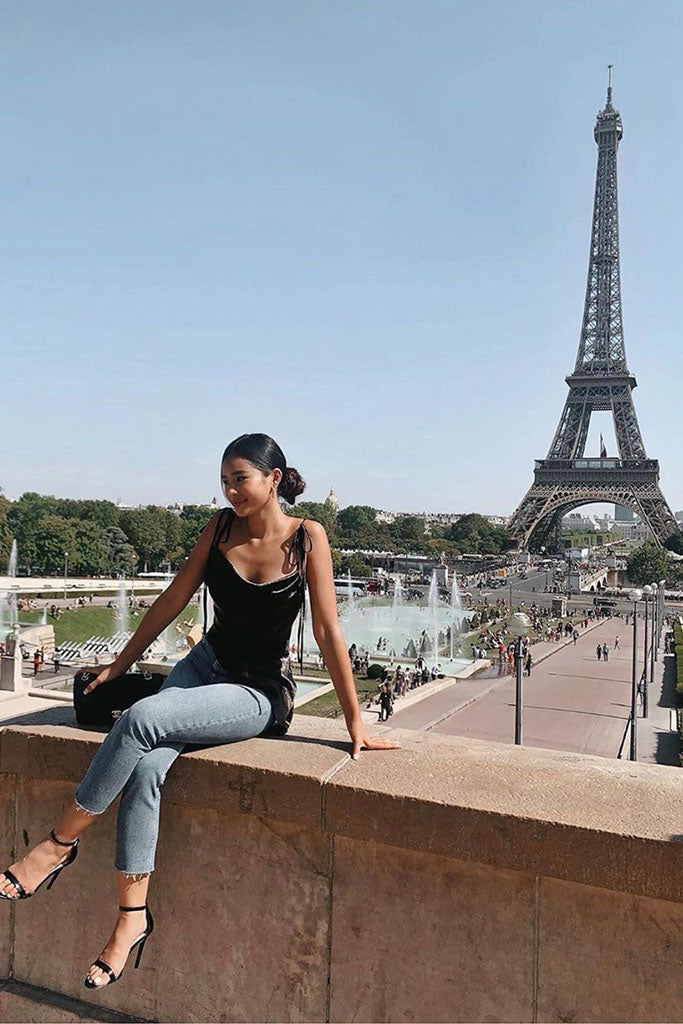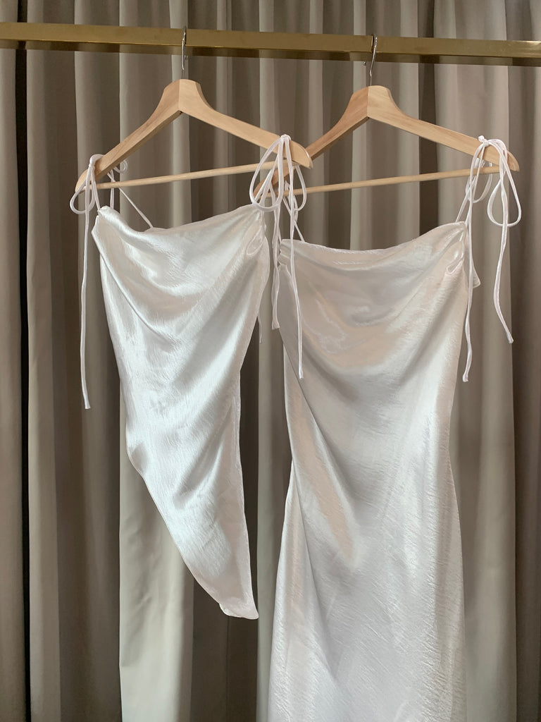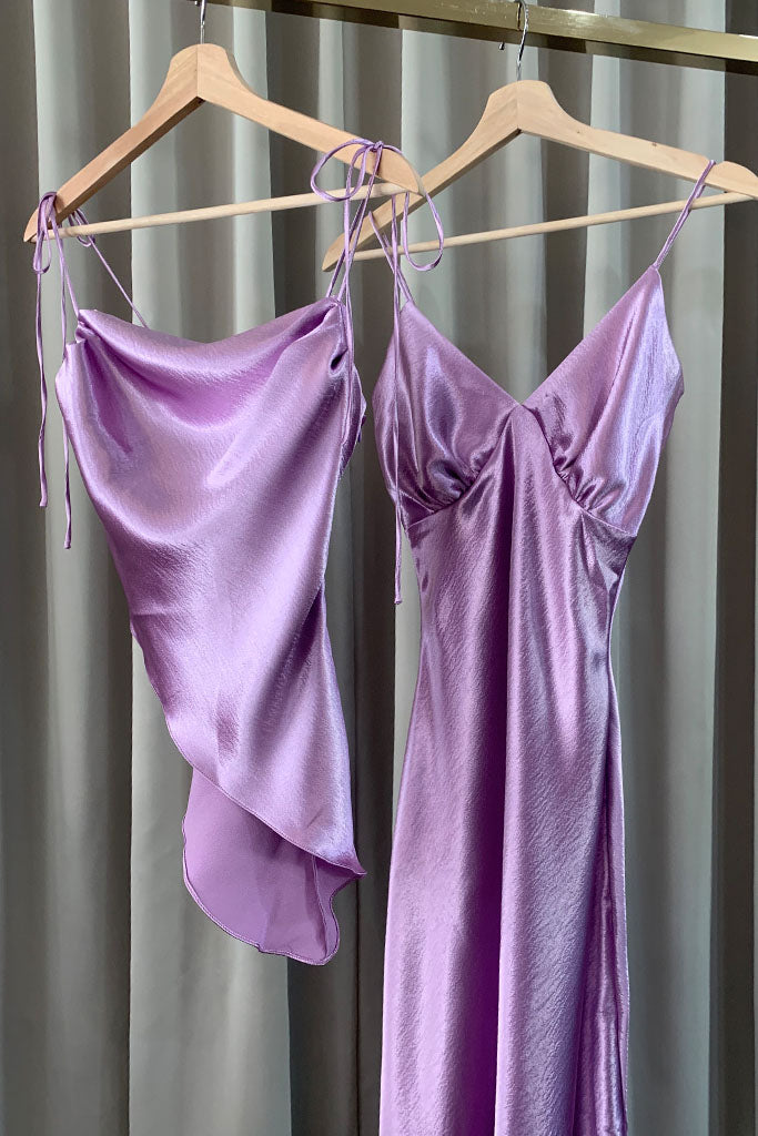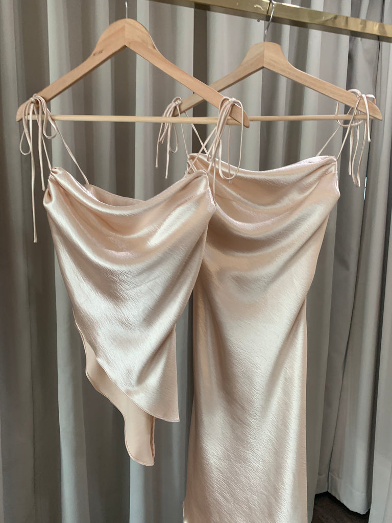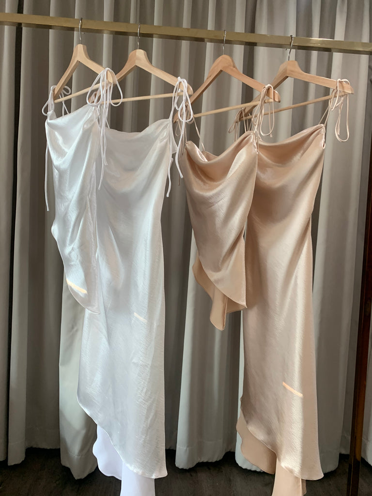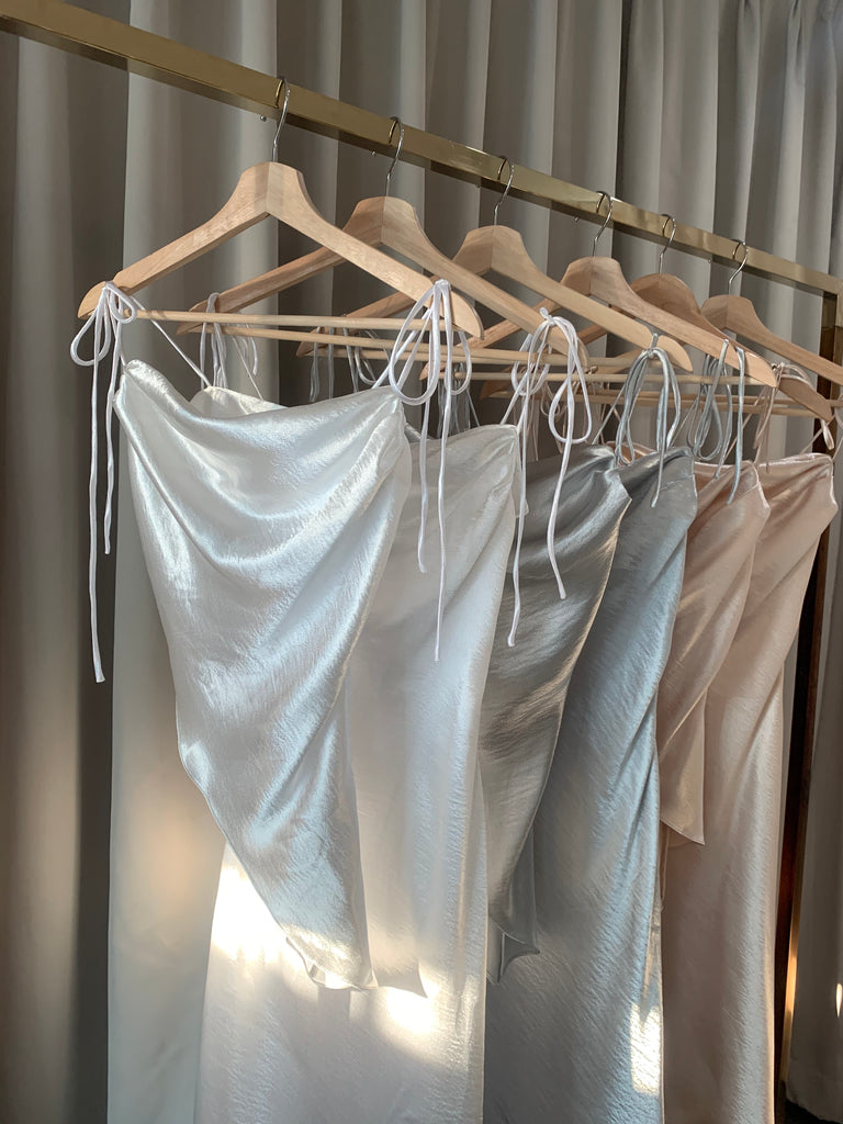 Stolen Studio’s exclusive piece exhibits a dramatic cowl neck. It has bow-tie straps to be fitted through the bodice in a flirty silhouette. It’s crafted with an asymmetric hem. Dress it down with straight-leg denim and ankle boots on the weekend.