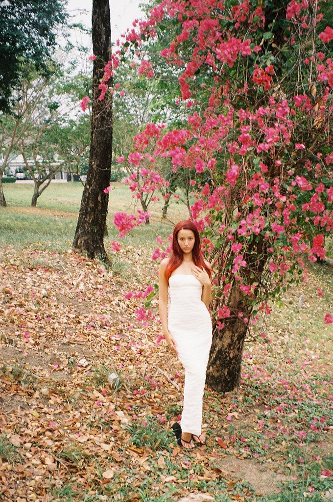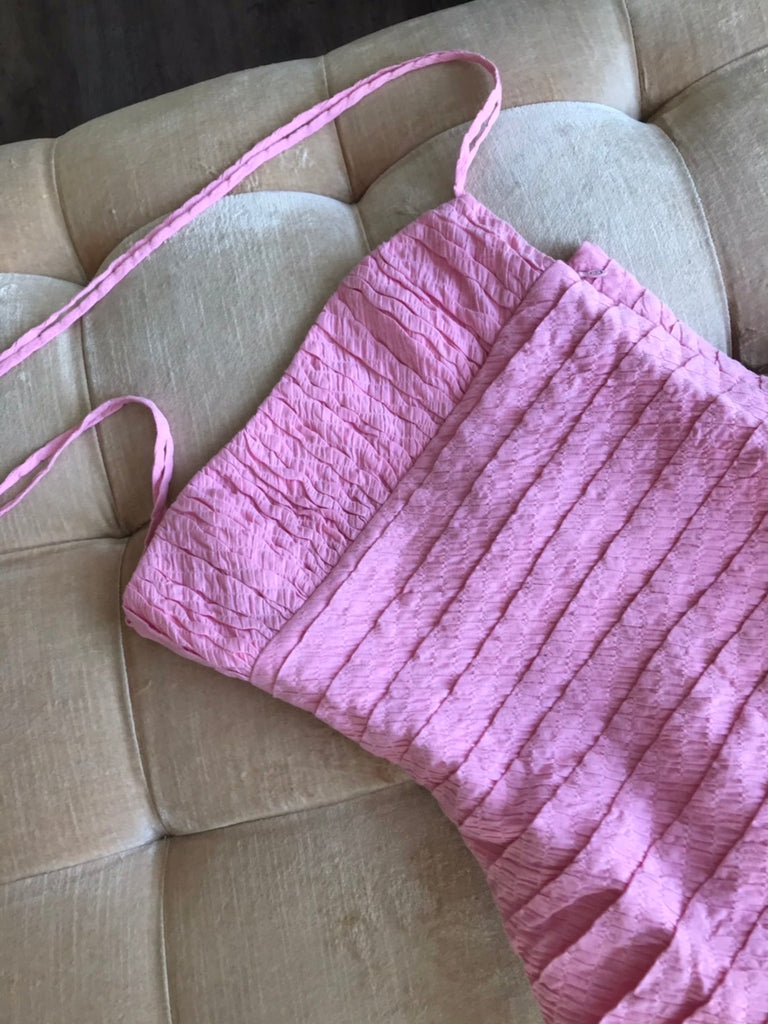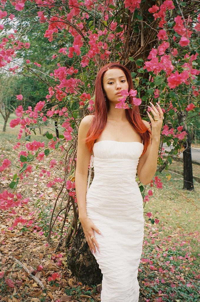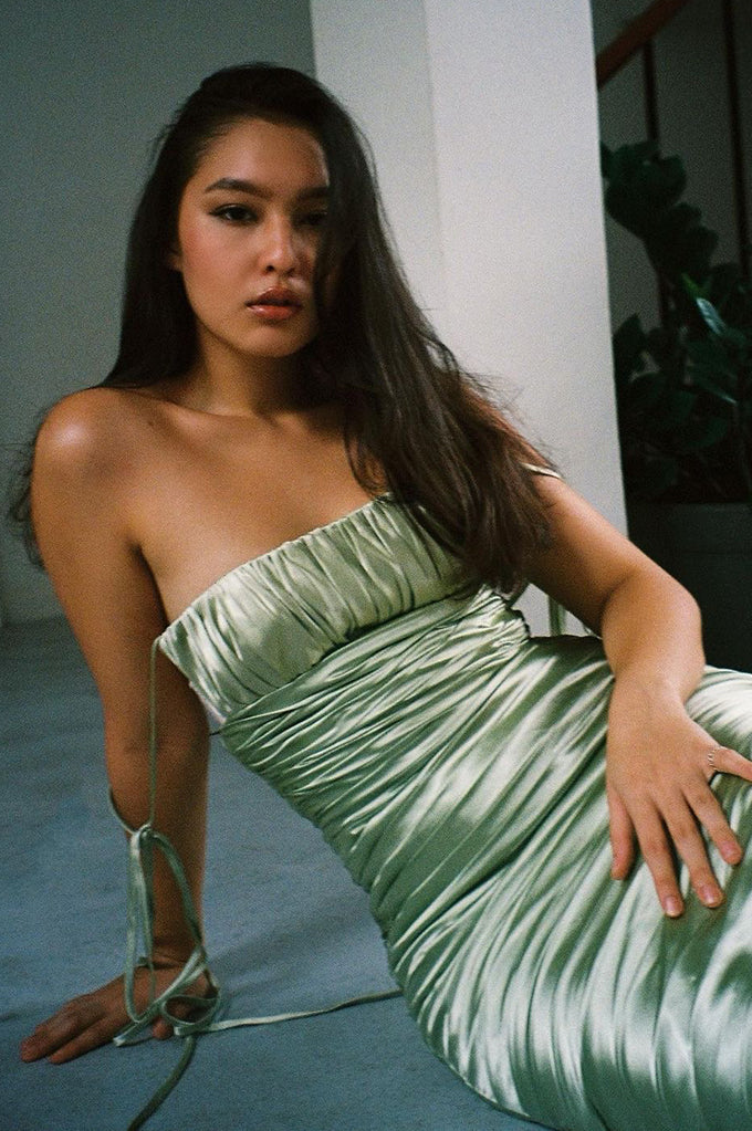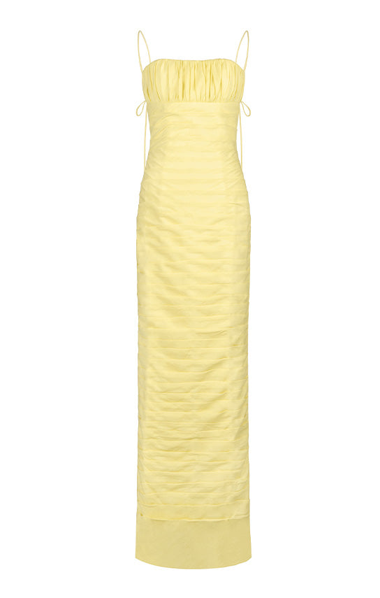 Hand draped maxi dress, cropped bust, Adjustable exaggerated tying straps. Exquisite detailing.