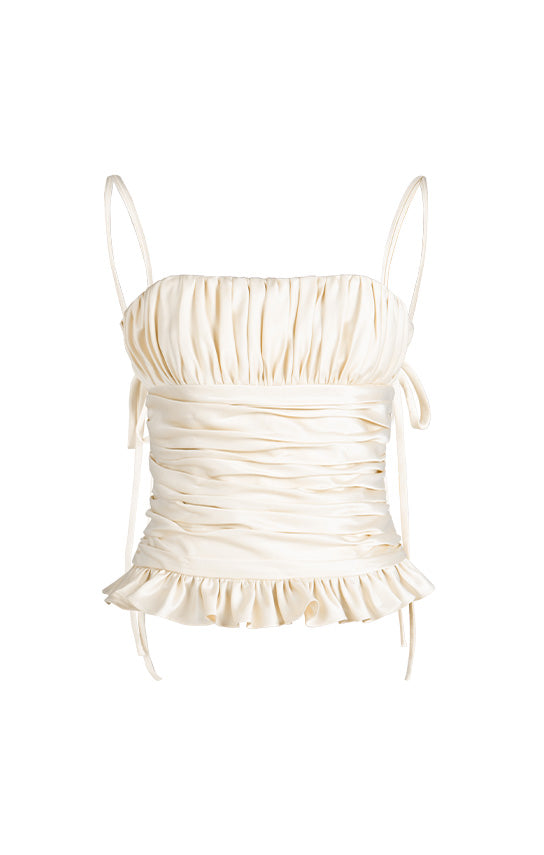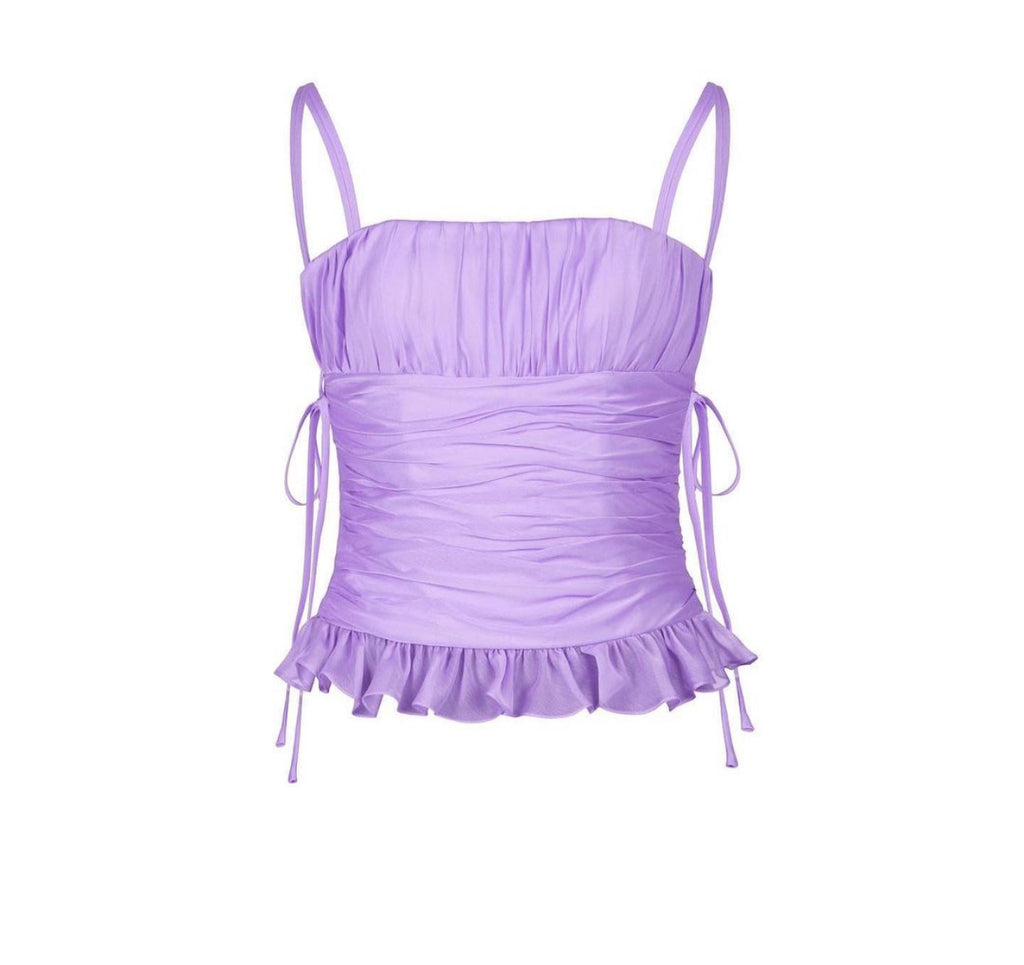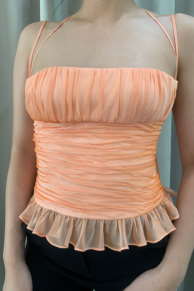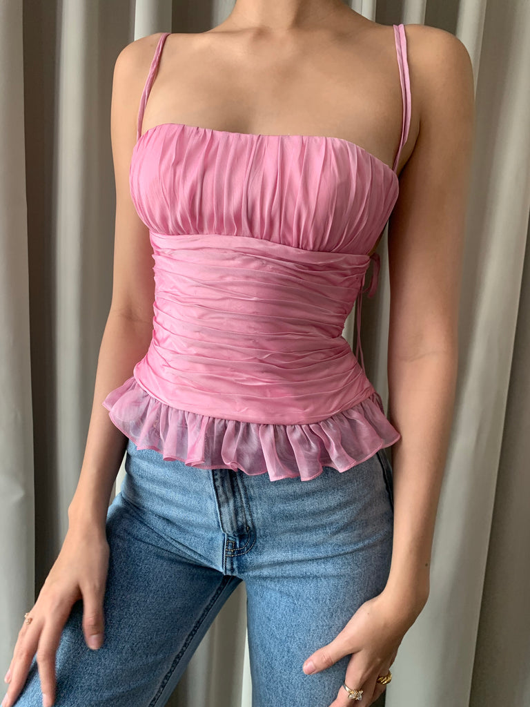 Stolen Studios x Cha Collective, Cha Cha Mini Top is made from lustrous chiffon. Lining with Spanish Silk. It has an elegant hand draped effect along the bust and tiered ruffling throughout. It has an adjustable tying straps.