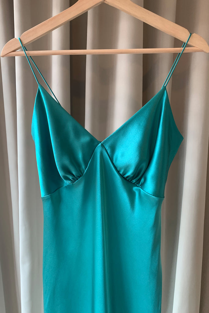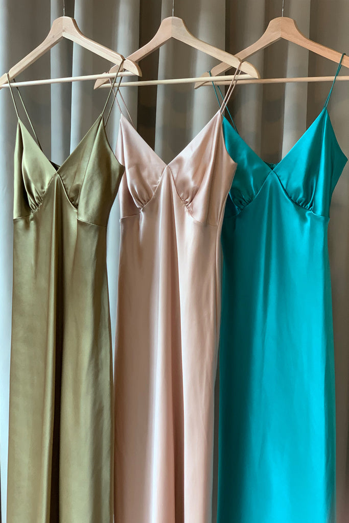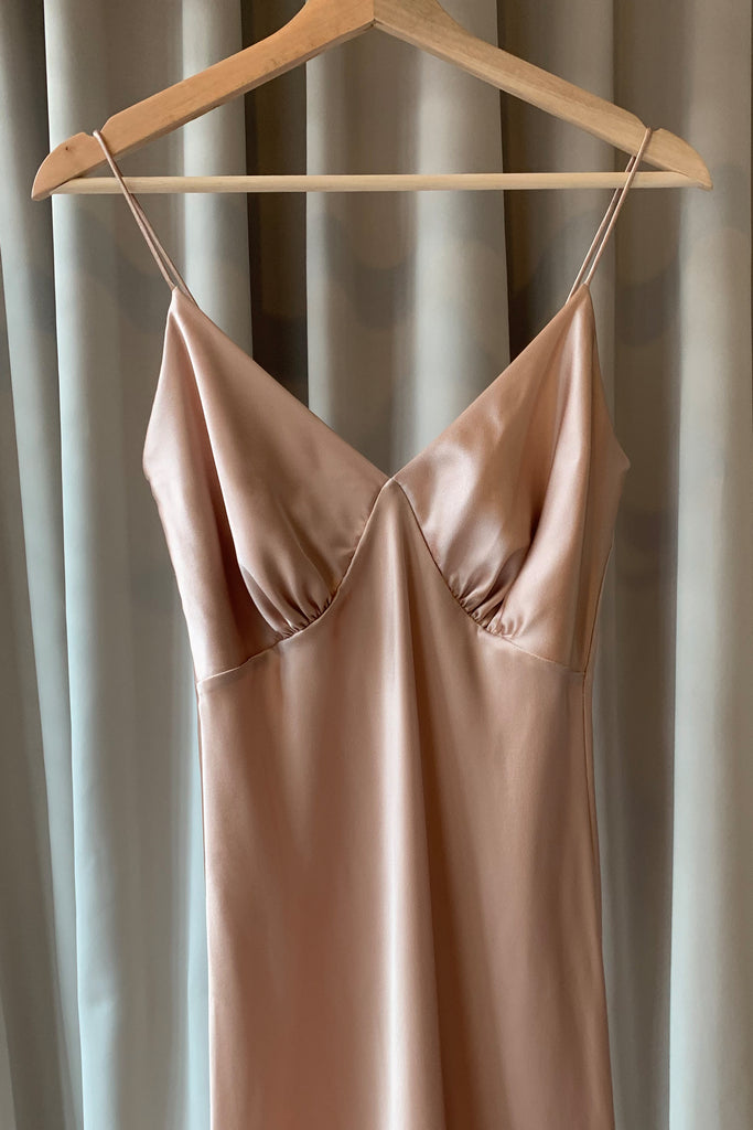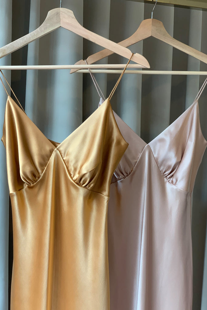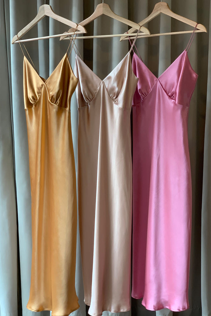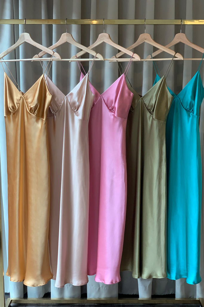100% Silk Slip Dress is designed with a v-neckline and open back spaghetti straps. The bodice is constructed with subtle gathering at the bust. Stays fitted through the waist before this beautiful silk- piece falls into a slightly flared hem that hits above the ankle and move beautifully as you walk. Giving the piece versatility to be styled for day or night.