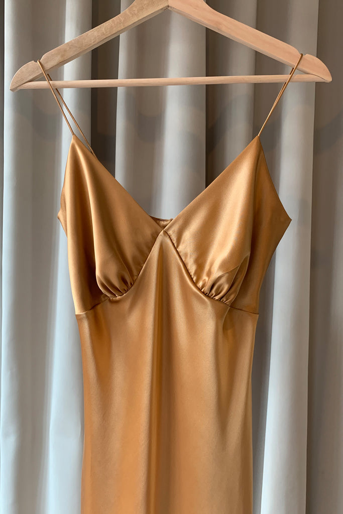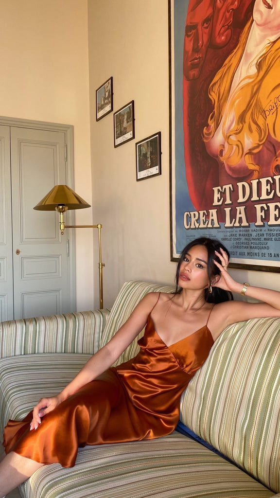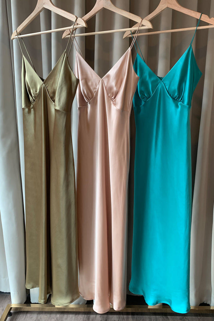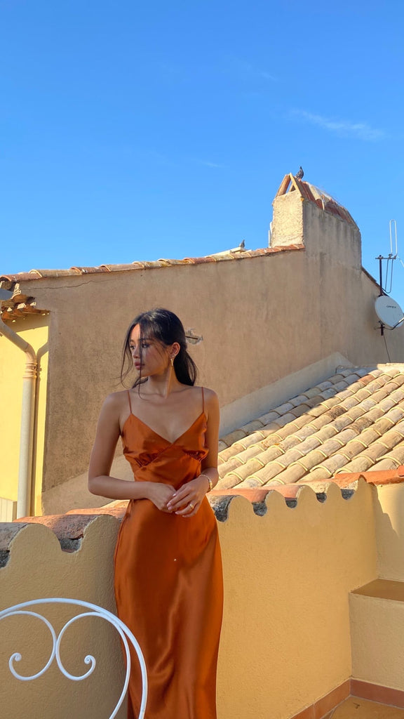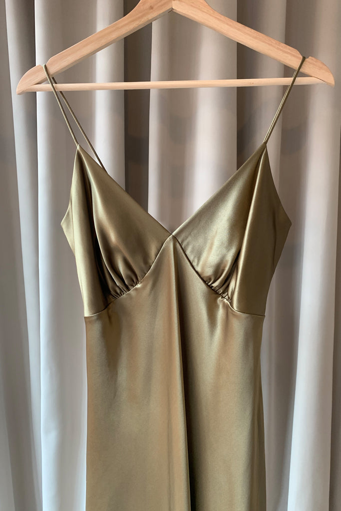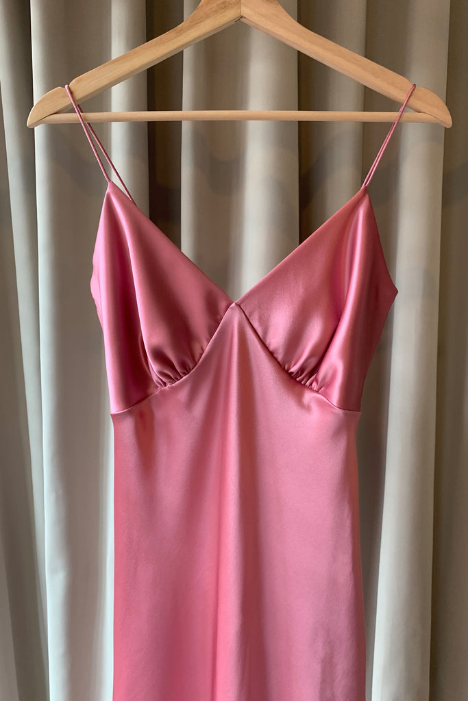 100% Silk Slip Dress is designed with a v-neckline and open back spaghetti straps. The bodice is constructed with subtle gathering at the bust. Stays fitted through the waist before this beautiful silk- piece falls into a slightly flared hem that hits above the ankle and move beautifully as you walk. Giving the piece versatility to be styled for day or night.