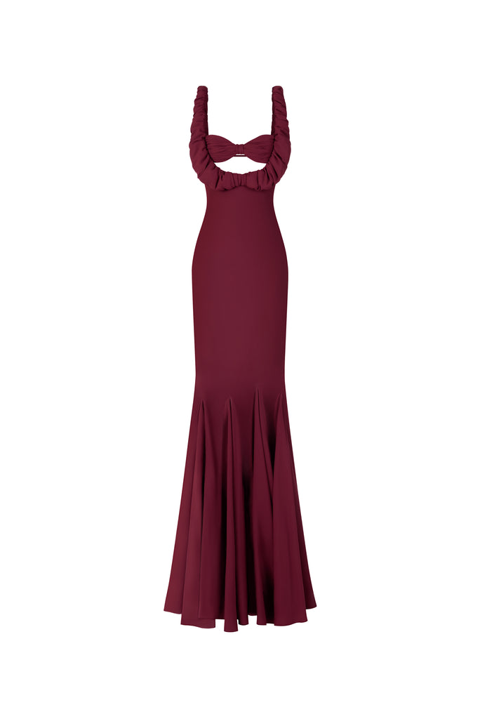 • Hand-draped croissant-shaped folds sculpt the bust and shoulder straps