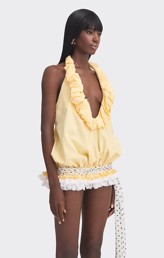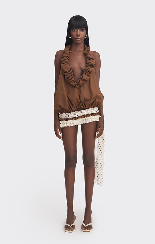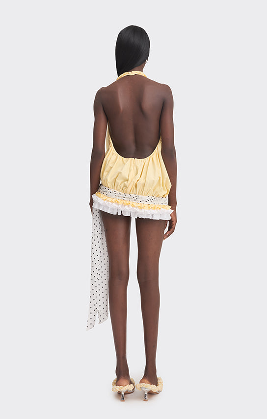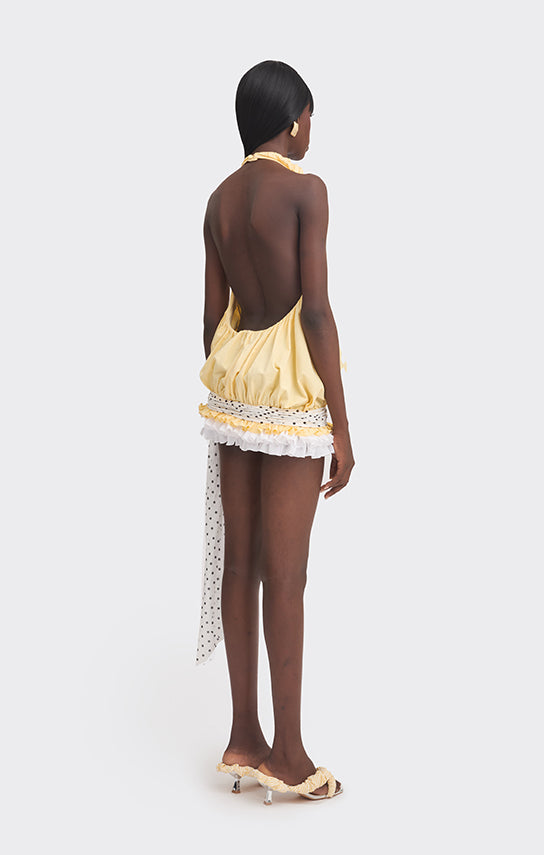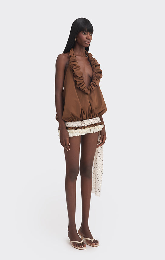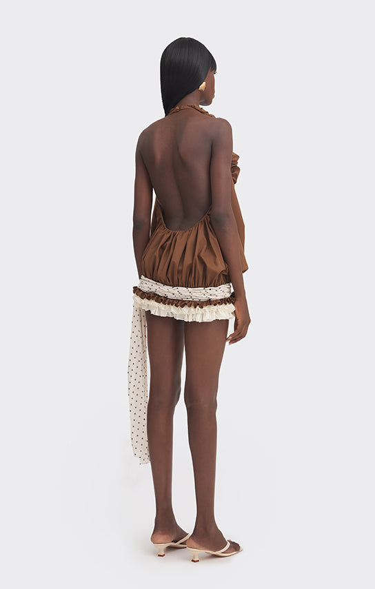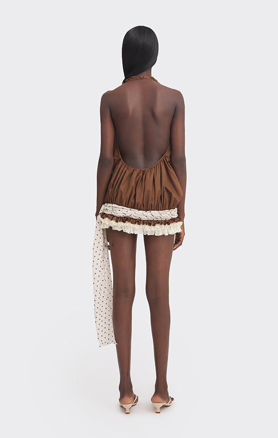 - Hand-draped fabric detail at the low waist, finished with a tie