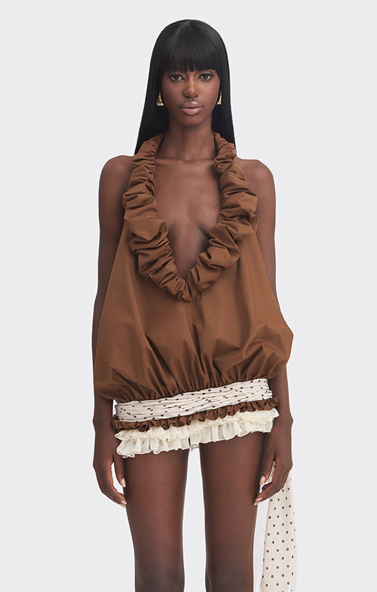 - Hand-draped, croissant-inspired shape along the neckline