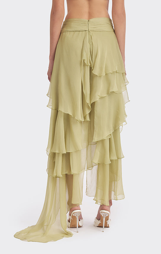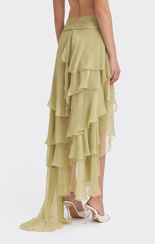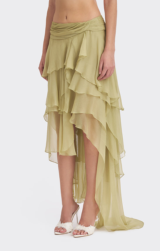- Features an asymmetrical skirt