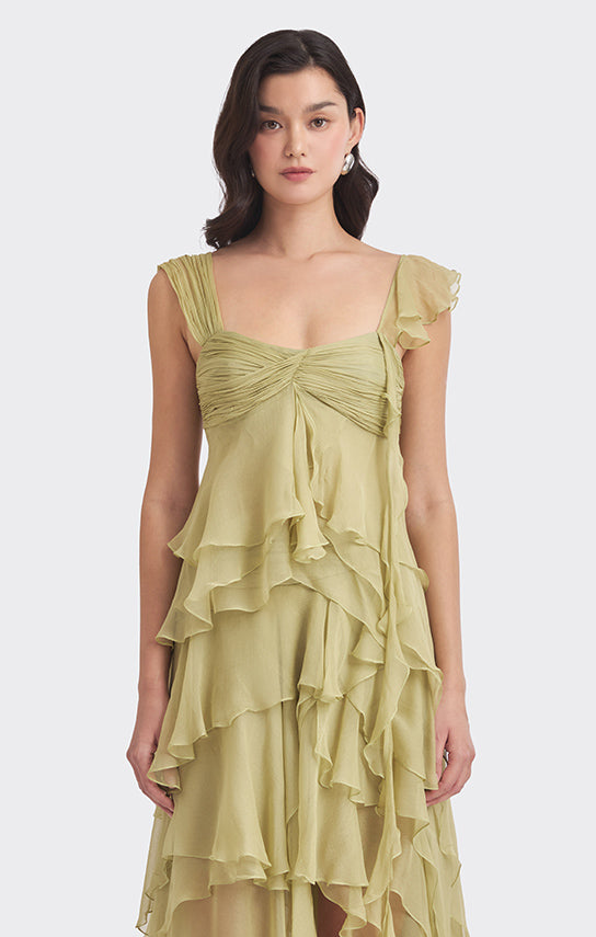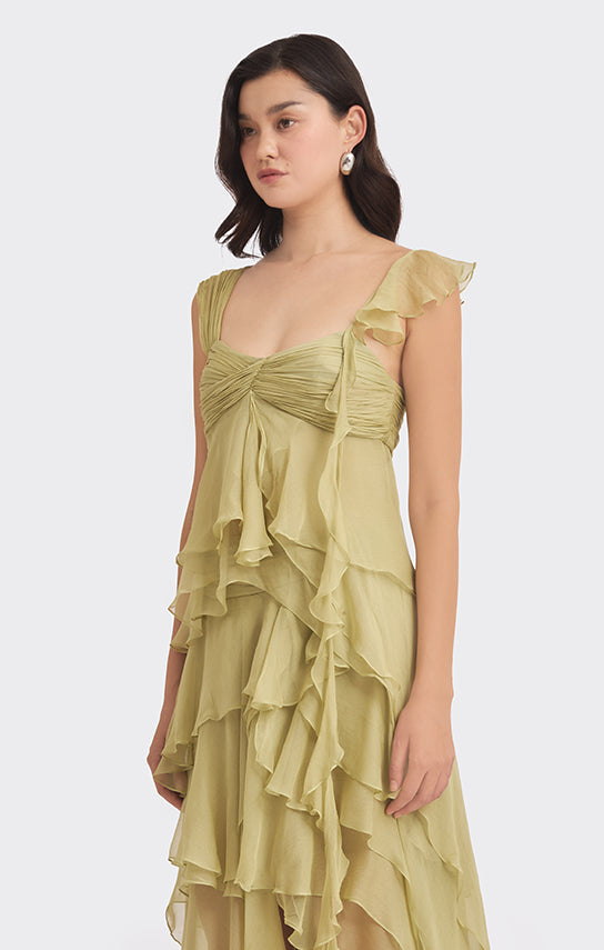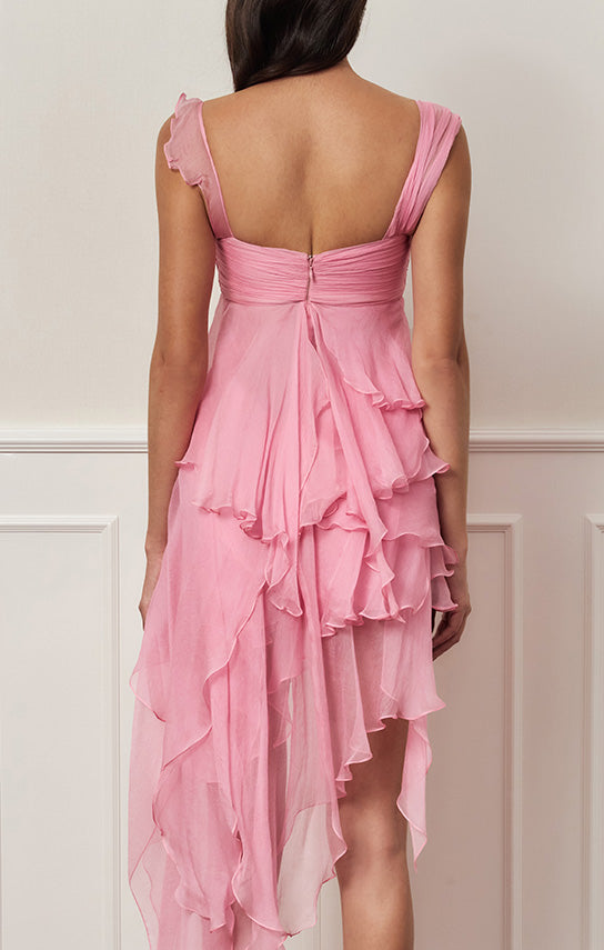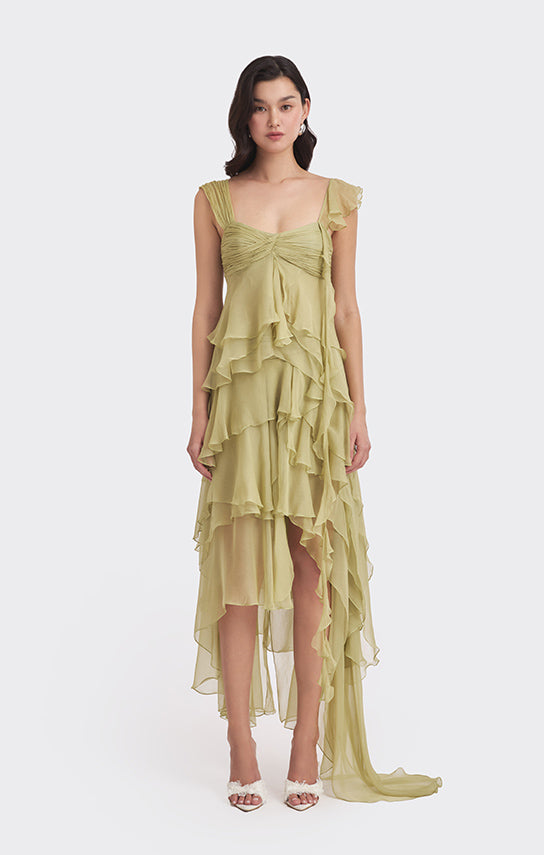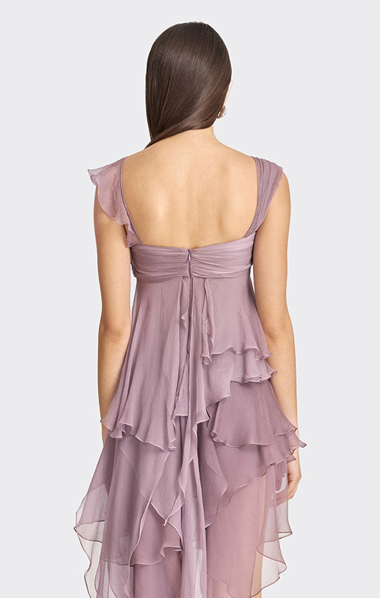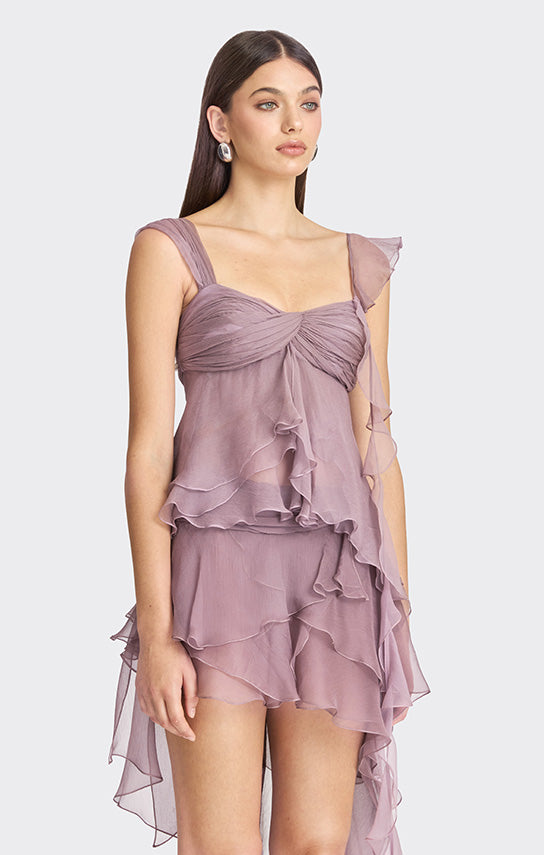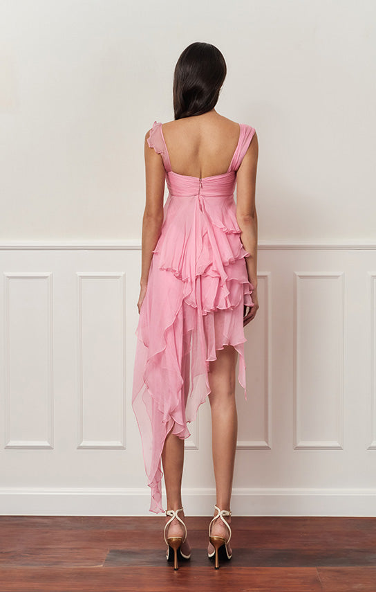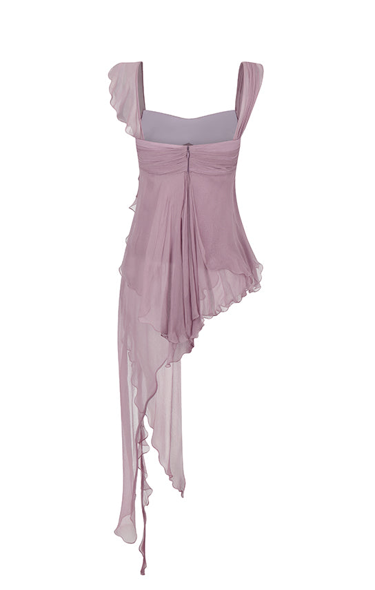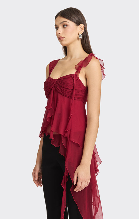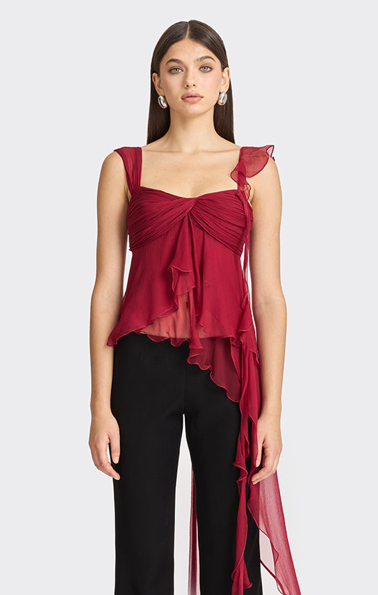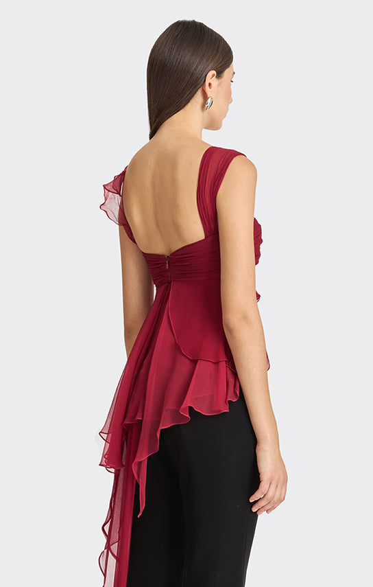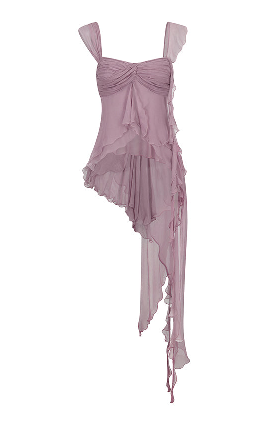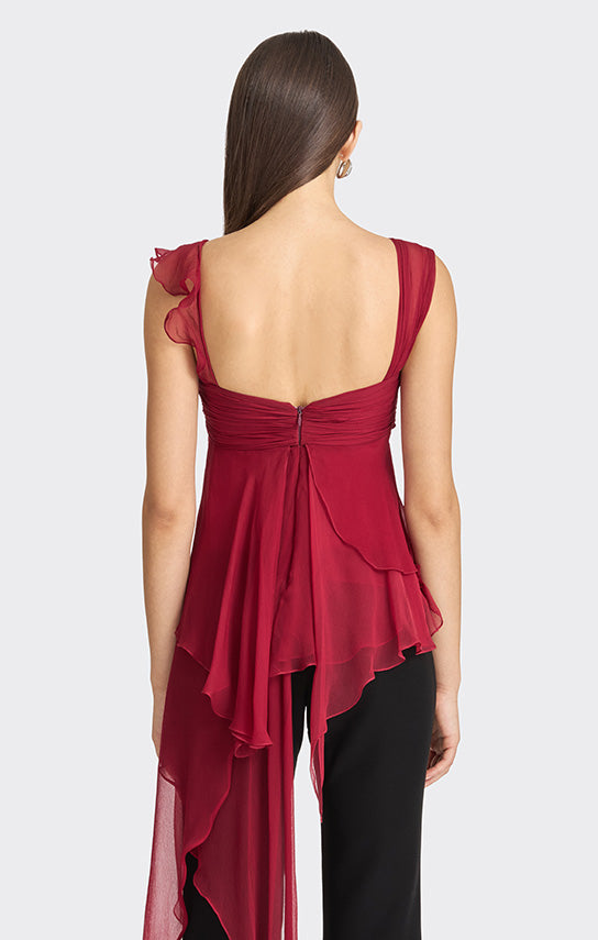 - Features an asymmetrical design with one side draped strap and the other side with bias ruffle details
