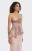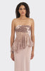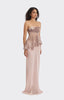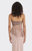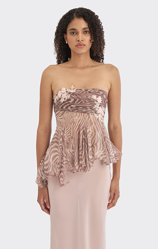 A zebra print made for daydreams. This strapless top flows from a softly sculpted bust into a fluttering peplum, hand-draped in crinkled chiffon. Lace embellishments add a delicate contrast—ethereal but grounded.