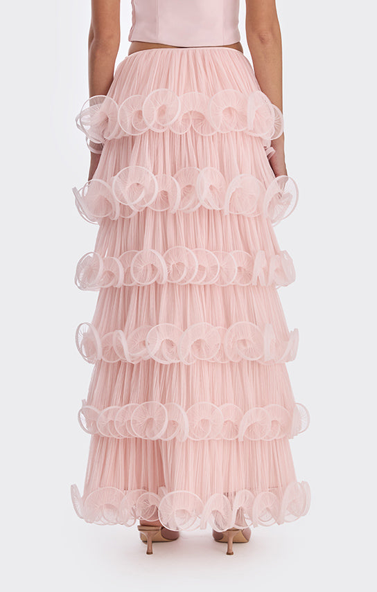 - Embellished with hand-placed circular ruffles for a voluminous look