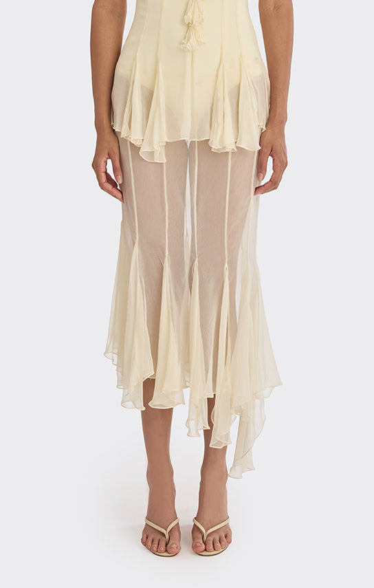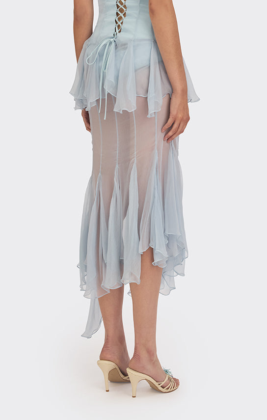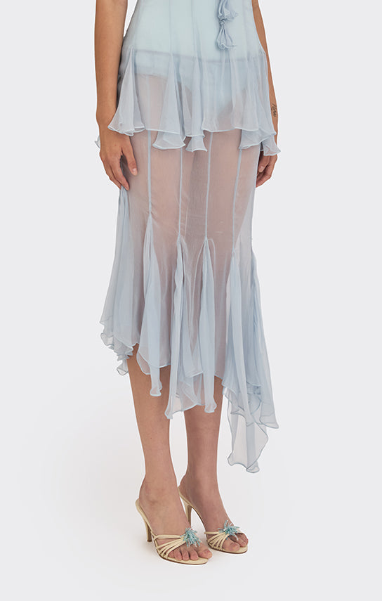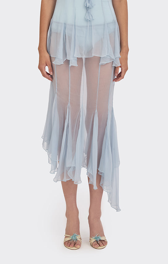 Airy and wave-like, this sheer chiffon skirt echoes the softness of the sea.
