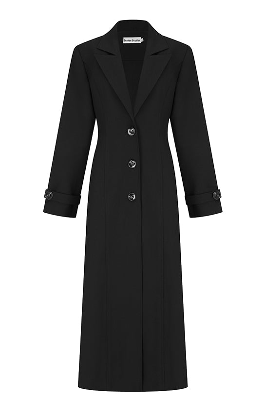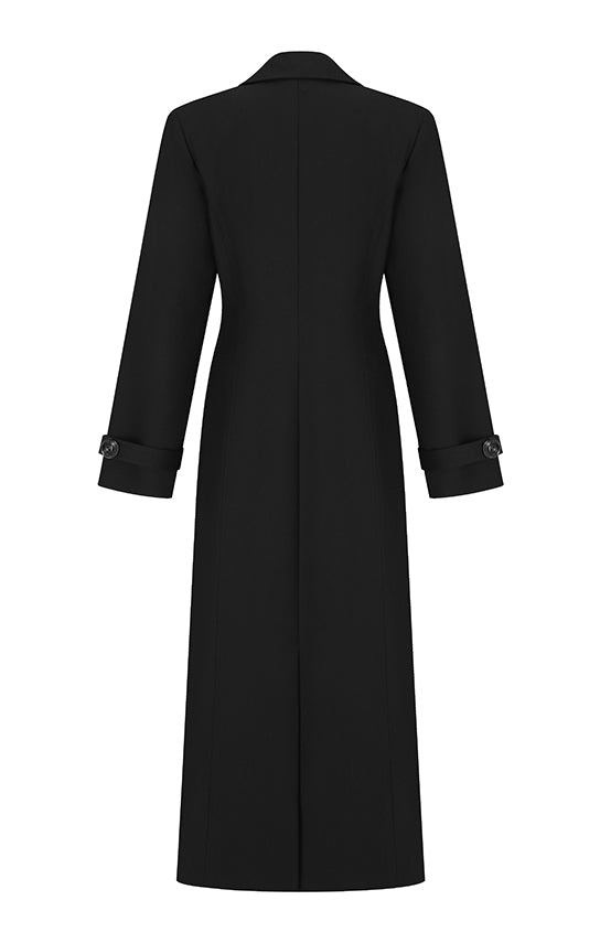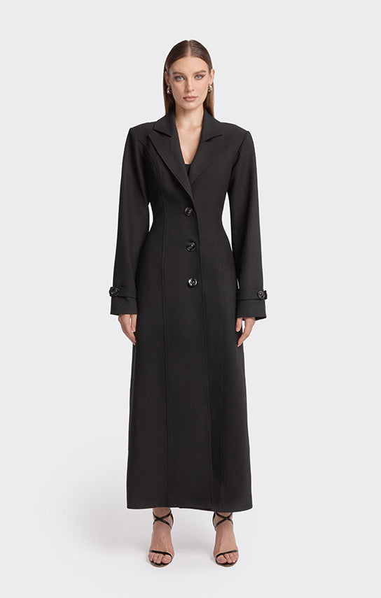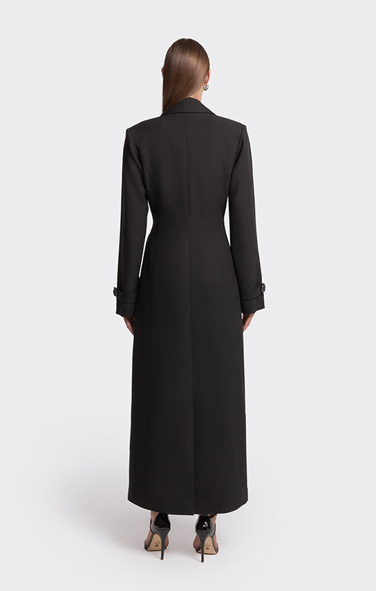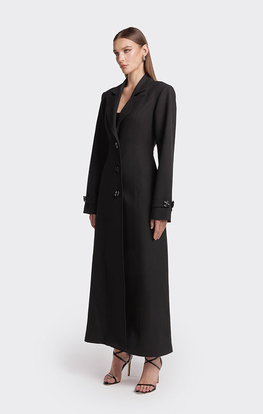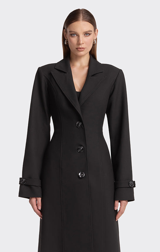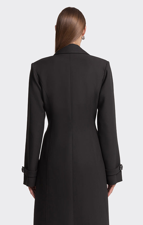 - Tailored fit with a longline silhouette, featuring a single-breasted design and elegant peak lapel